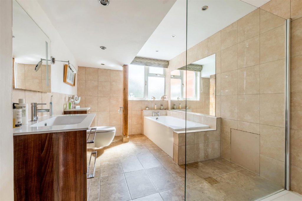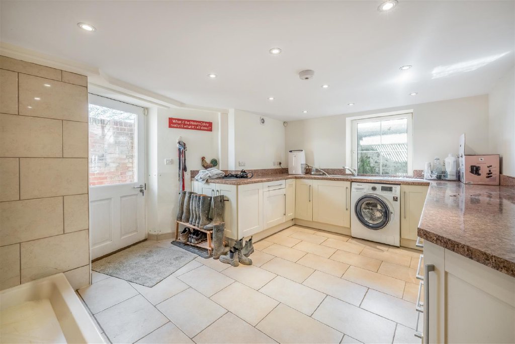 The kitchen also provides access to the basement, where the house reveals a more playful and practical side. Here there is a gym or studio with air conditioning and direct access outside, a wine cellar and a well fitted utility room complete with a dog shower and a door leading out to the garden.