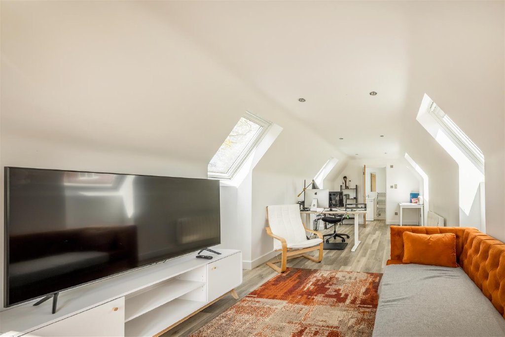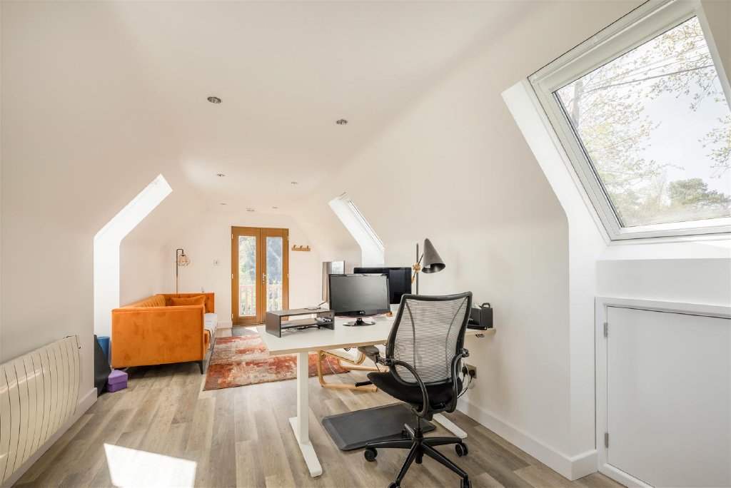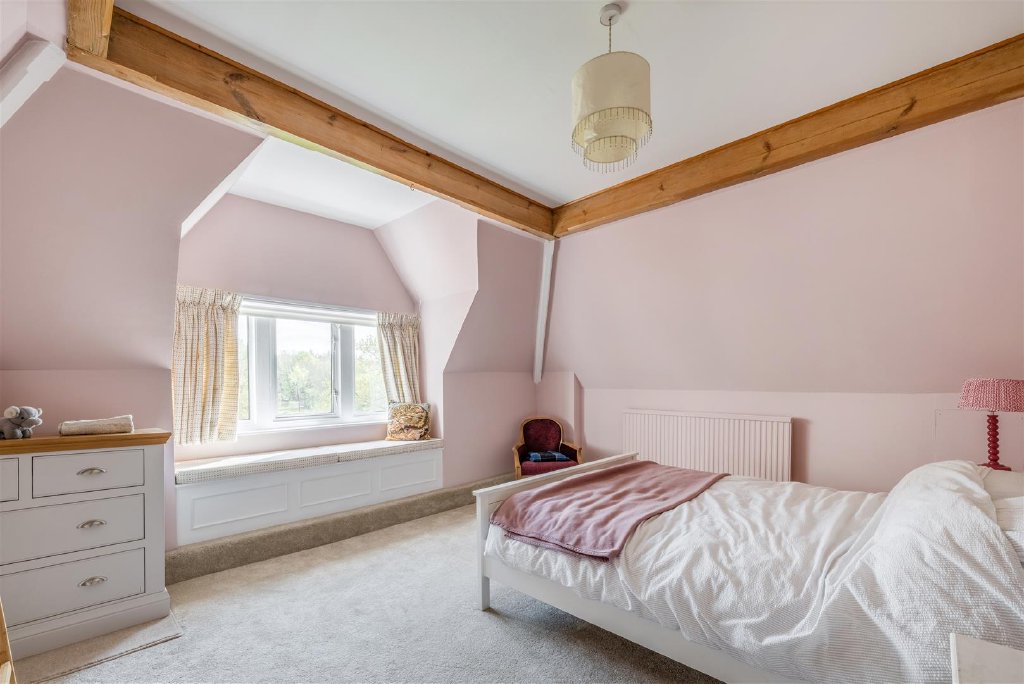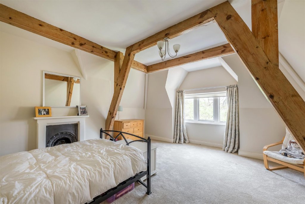 The staircase rises to the first floor, where the principal bedroom forms a peaceful retreat, complete with a dressing room fitted with wardrobes and a beautifully appointed en suite bathroom. There are two further bedrooms on this level along with a computer room or study and a well finished family bathroom. The second floor offers two additional bedrooms, both full of character with exposed beams, one featuring a cast iron fireplace with a duck’s nest grate and the other benefitting from concealed storage. A shower room and a games room or sixth bedroom complete the accommodation, offering excellent flexibility for guests, teenagers or home working.