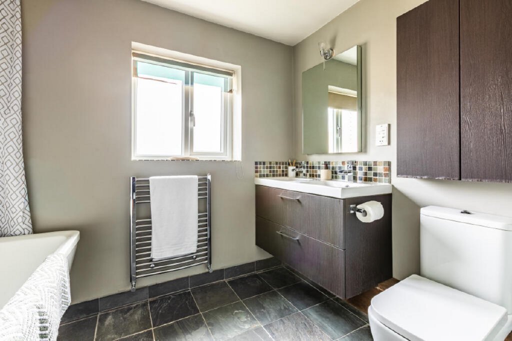 The stylish bathroom features a white suite to include a freestanding bath with Rain head shower over,, w.c, wash hand basin, fitted storage cupboards contemporary lighting and wall tiling with slate floor tiling with underfloor heating.