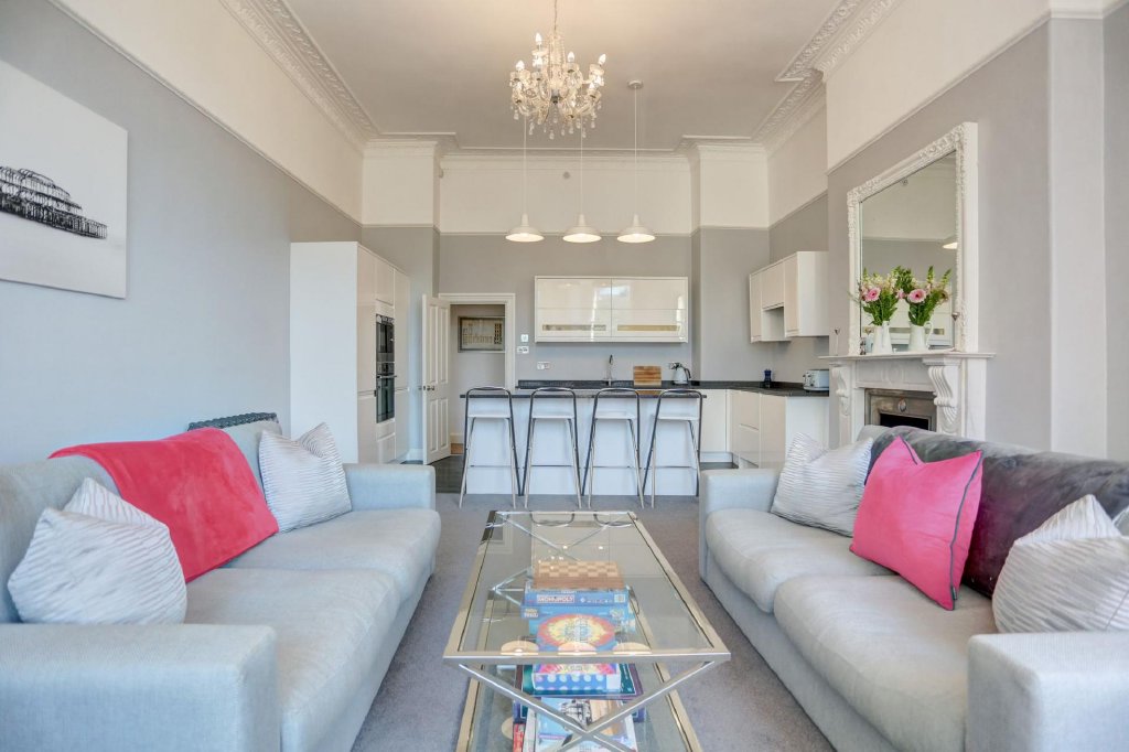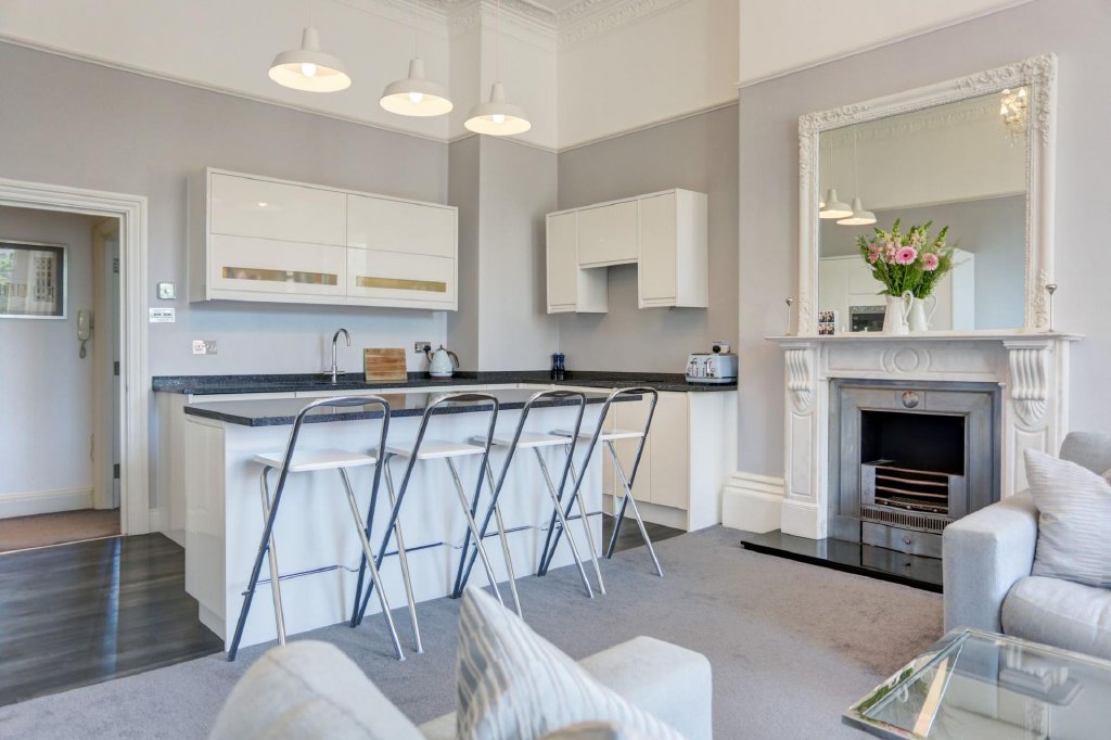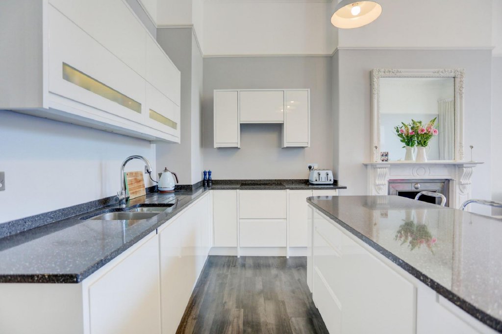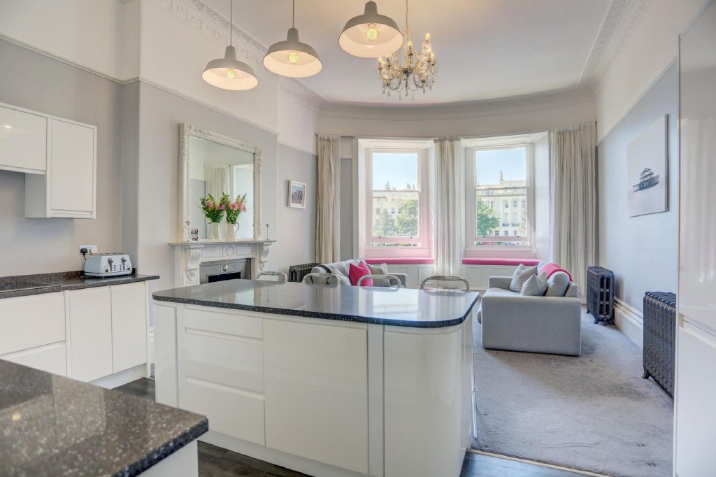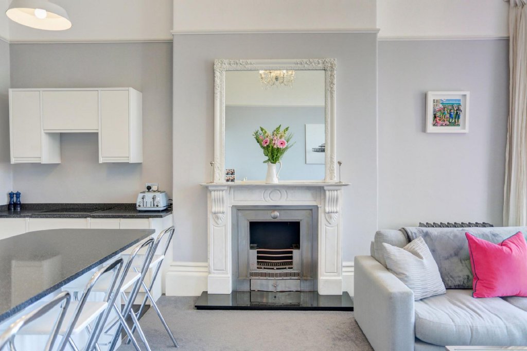 This raised ground floor apartment has been meticulously maintained to an exceptional standard. Decorated in a fresh palette of Farrow & Ball white and soft grey ‘Calluna’, it is presented with an immaculate finish throughout. This is refined coastal living with understated elegance.