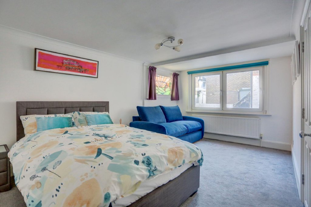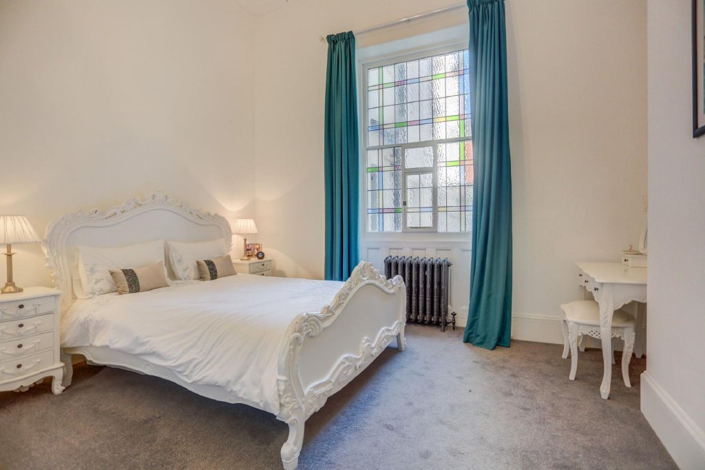 The property is rich in original features, including high ceiling coving in the main living areas and stained-glass windows in the bedrooms. These period details are complemented by a contemporary interior palette of cool greys and a sleek monochrome kitchen, adding a modern twist to the home’s historic character.