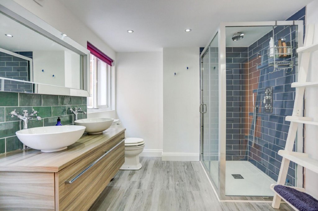 At the far end of the hallway is the second double bedroom, featuring a charming stained-glass window depicting a rural scene. This room also benefits from a high-spec ensuite shower room, echoing the quality of the main bathroom.