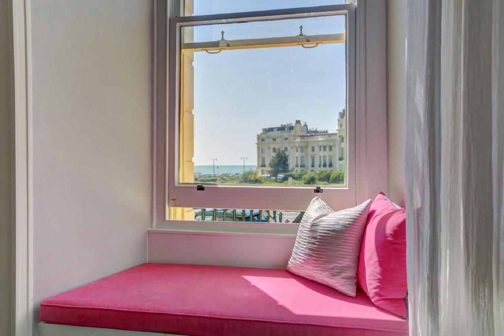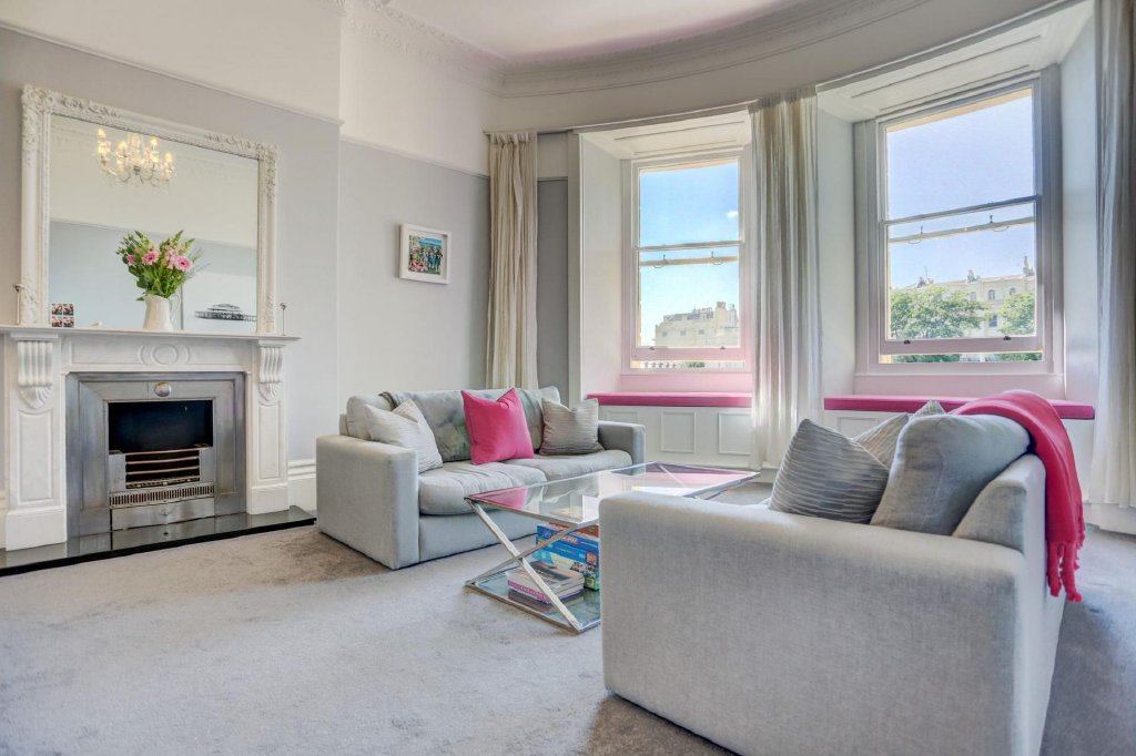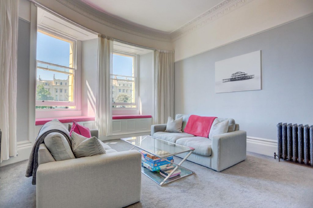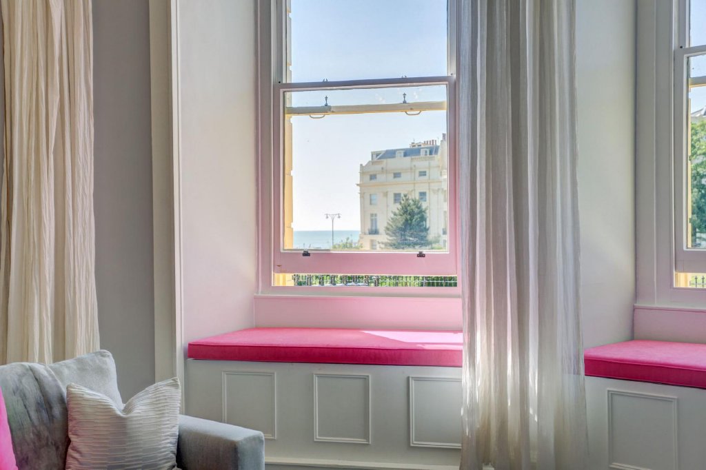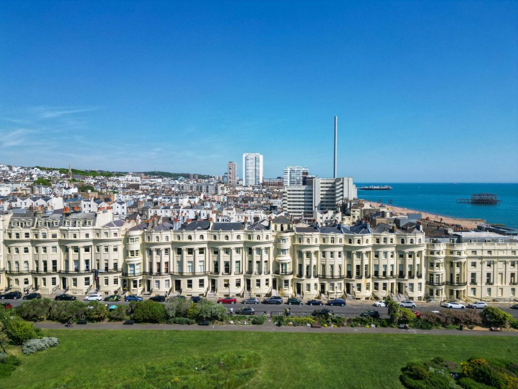 The iconic cream stuccoed Brunswick Square opens directly onto Hove Lawns and the seafront. Its opulent Regency architecture, dating from the 1830s, is showcased in a sweeping façade of ornate Corinthian columns and distinctive curved bay windows. Grade I listed, the properties encircle public gardens at the centre of the square, with the sea just beyond.