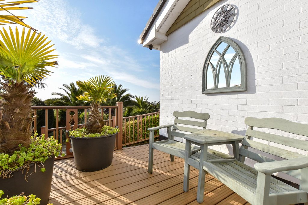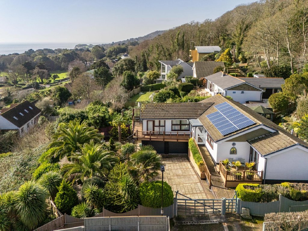 Tucked away at the end of a peaceful residential cul-de-sac and securely positioned behind electric gates, this exceptional elevated three-bedroom bungalow commands breathtaking, far-reaching views across the English Channel. Immaculately presented throughout and offered for sale chain free, the property offers a rare opportunity to acquire a private coastal retreat surrounded by beautifully landscaped Mediterranean-style gardens, where sea views can be enjoyed from the majority of principal rooms.