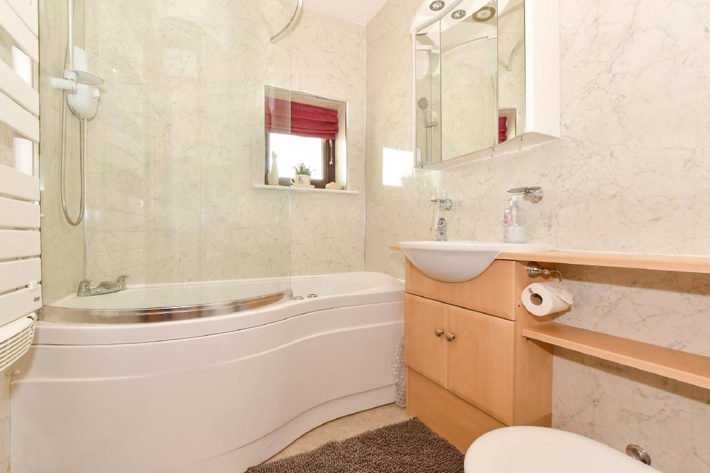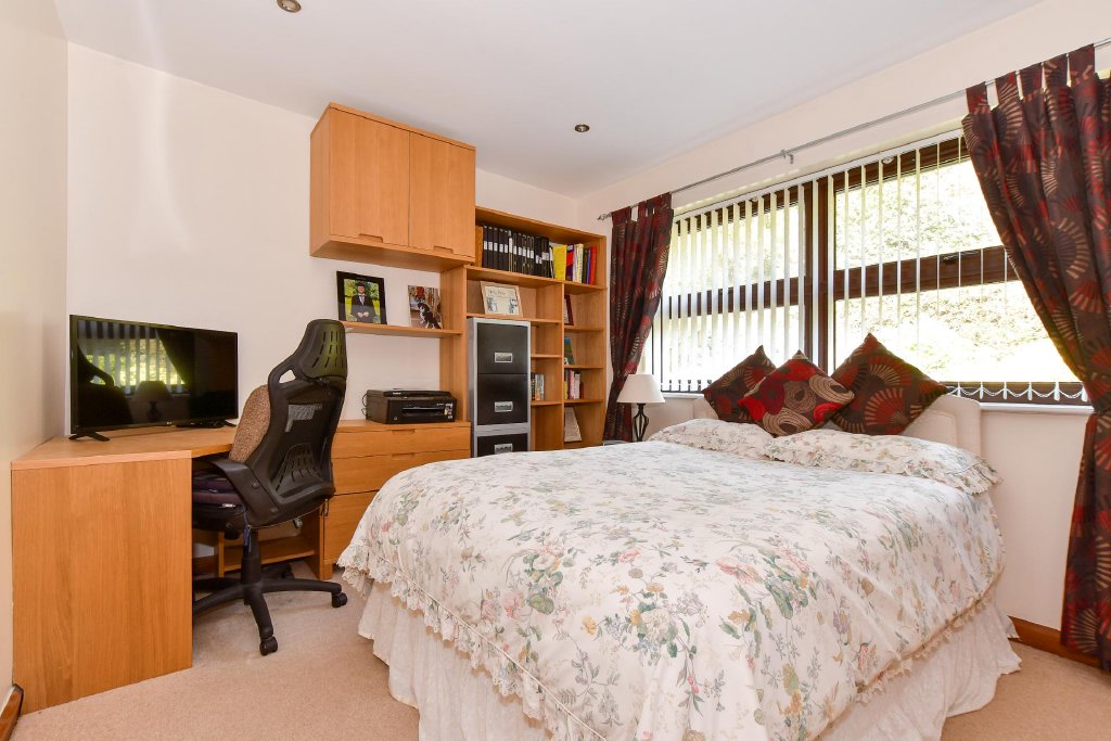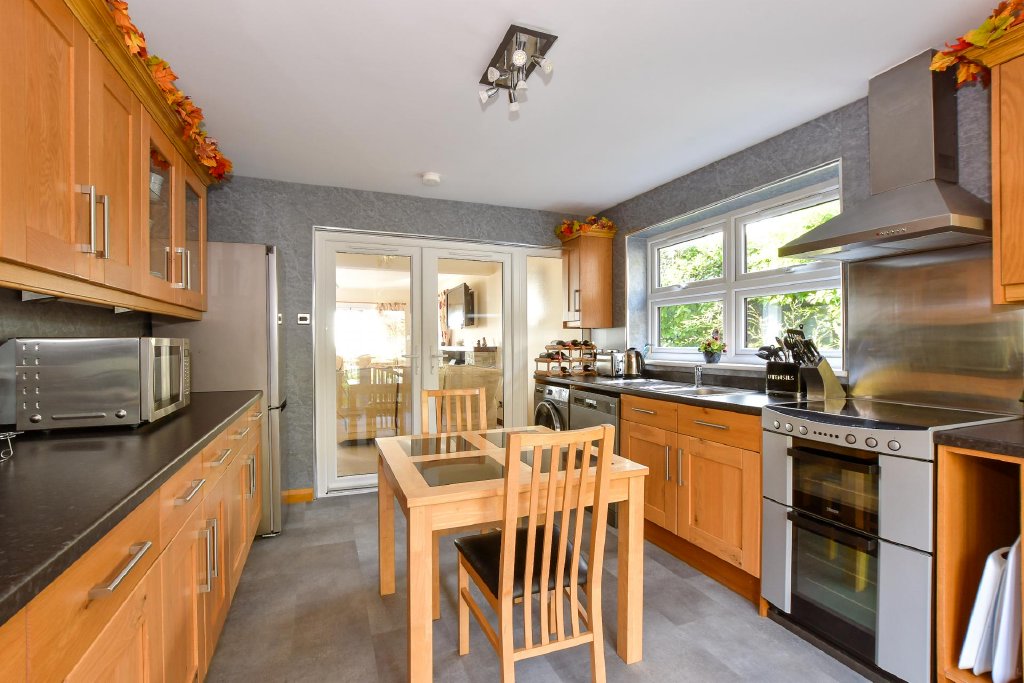 The kitchen is both stylish and functional, fitted with an extensive range of oak wall and base units complemented by contrasting black worktops. There is space for a freestanding oven, while there is ample space for a fridge freezer, washing machine, and dishwasher. Double doors open directly onto the rear garden, making al fresco dining and summer gatherings wonderfully convenient.