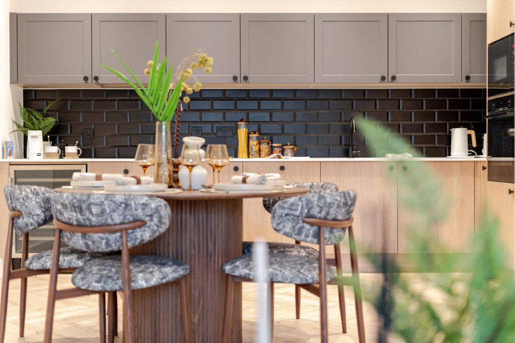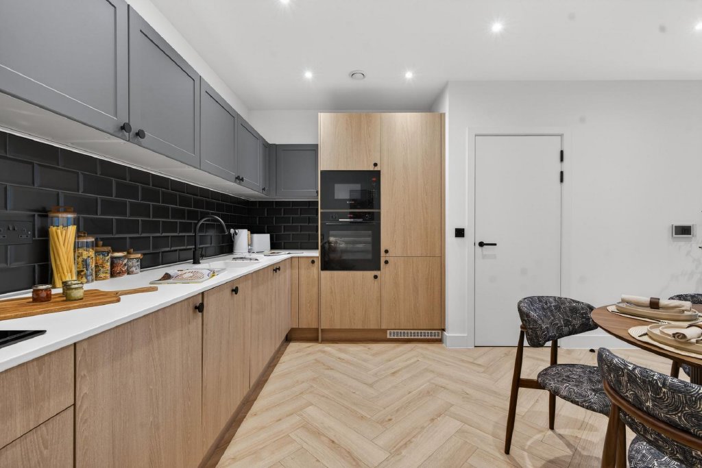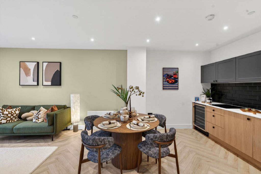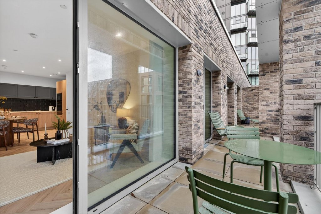 Inside, the apartment has been thoughtfully designed to create bright and comfortable living spaces that feel both modern and practical. The open plan kitchen, dining and living area forms the centre of the home, providing a sociable environment for everyday living and entertaining. Large glazed doors open directly onto a private terrace of approximately 222 sq ft, creating a seamless connection between indoor and outdoor space.