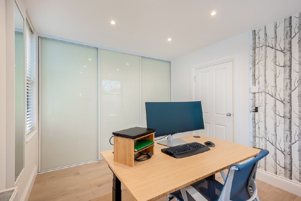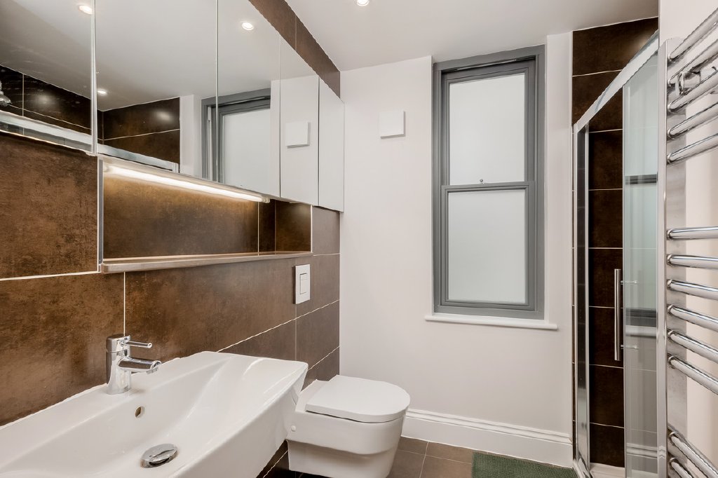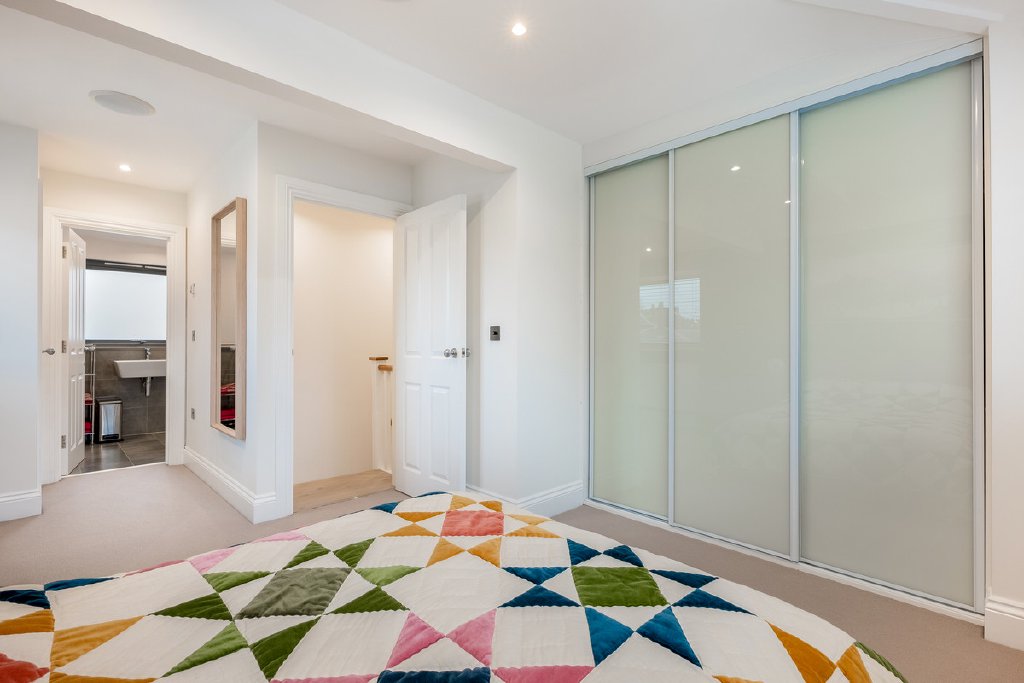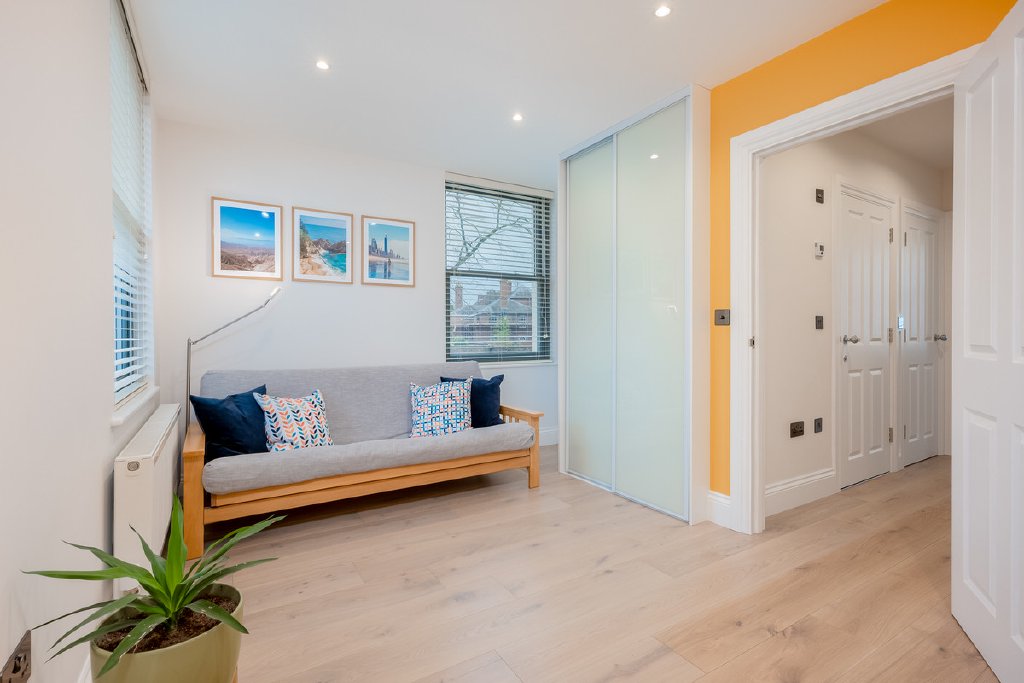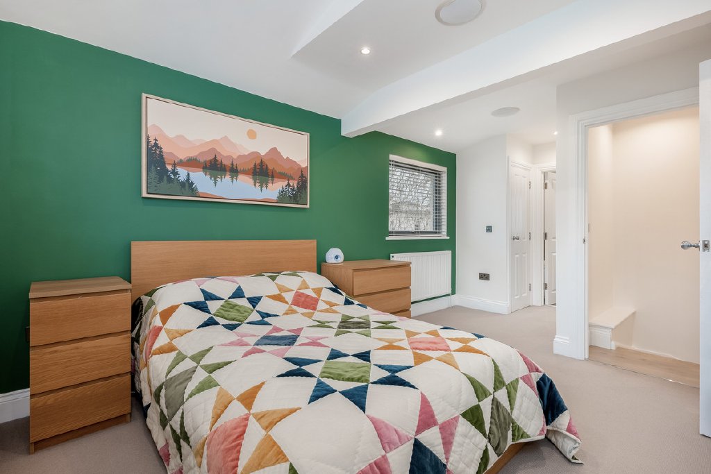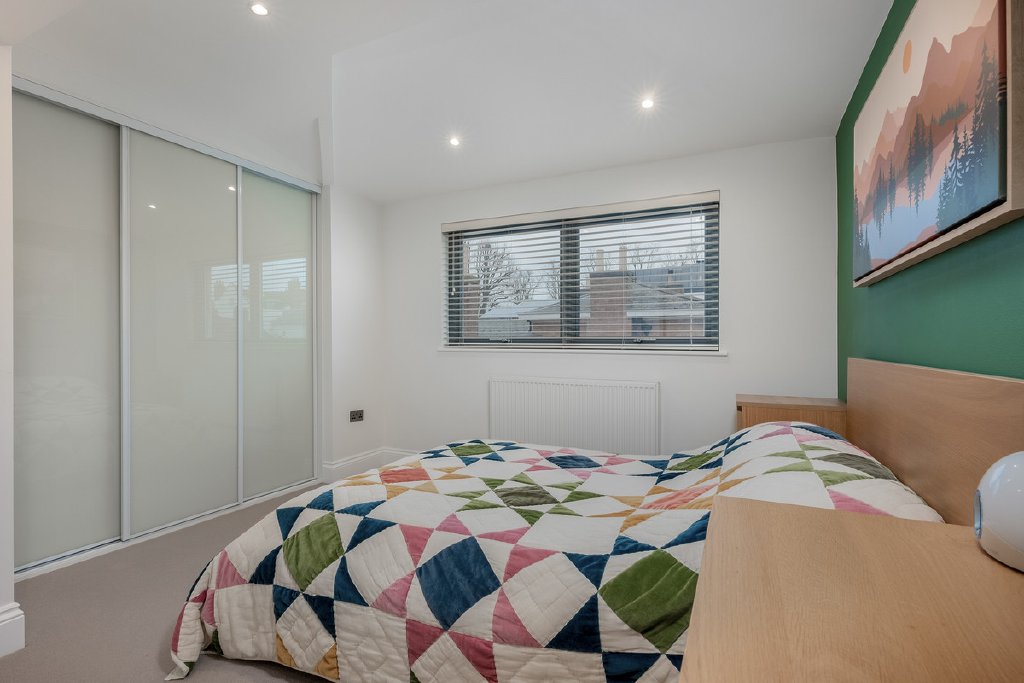 The bedroom offers excellent proportions, built-in wardrobes and natural light from dual aspect windows.