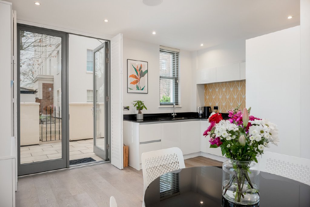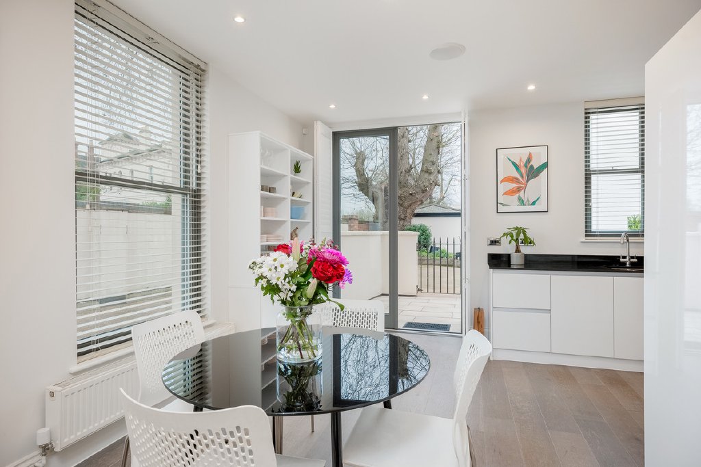 The spacious dining area is flooded with natural light from the dual aspect windows and French doors leading to the private courtyard beyond making this space an ideal setting for everyday family life as well as entertaining.