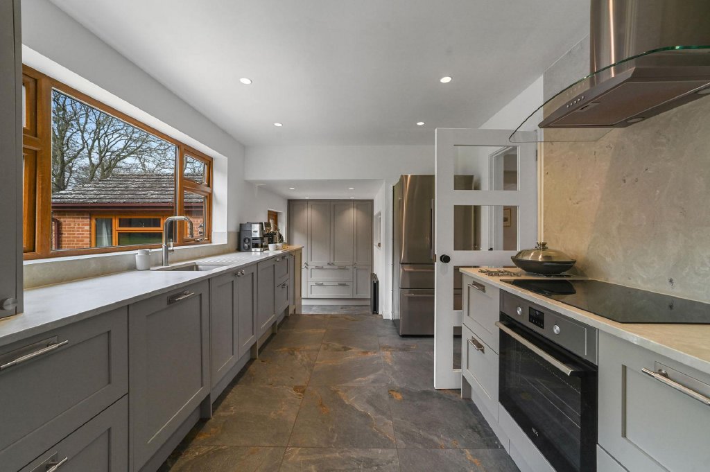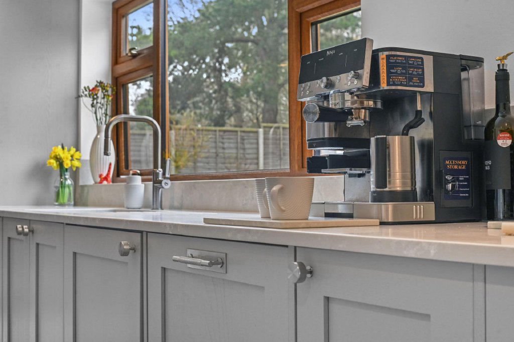 The Howdens kitchen has been carefully designed and upgraded to combine style, practicality and quality. Finished in a calming "Soft Pebble" tone, the wooden cabinetry provides an abundance of storage and is complemented by sleek composite quartz worktops with matching upstands, creating a seamless, elevated finish. Porcelain slate effect floor tiles complete the look, offering a durable and elegant foundation. Attention to detail is evident throughout, with high-quality fixtures and fittings, hidden sockets and discreet internal drawers keeping worktops clear and clutter-free. Carefully chosen handles and fittings add subtle character, while a double larder cupboard provides exceptional storage - a feature the current owner particularly values. Integrated appliances include an oven, Klarstein induction hob, dishwasher and washing machine, while a Domextra water softener and filtered tap water ensure everyday convenience. The kitchen also enjoys lovely views over the garden, making it a bright and welcoming space for cooking, entertaining, or simply relaxing and enjoying the surroundings. The overall result is a kitchen that feels both stylish and supremely functional, ready to meet the demands of modern family life.
