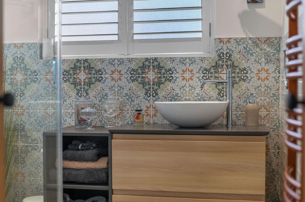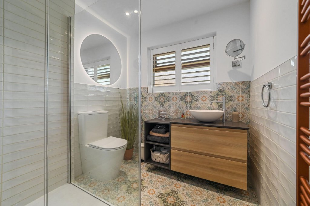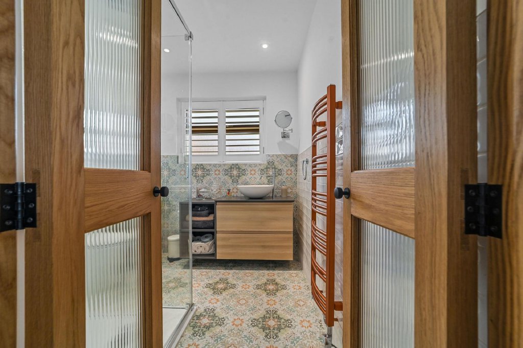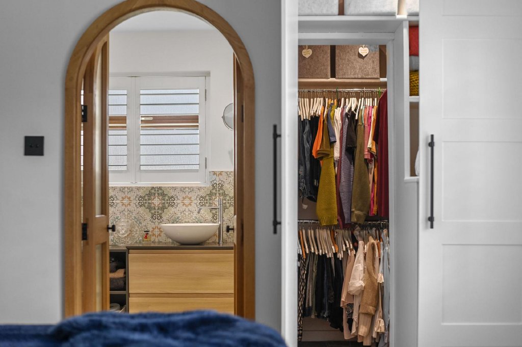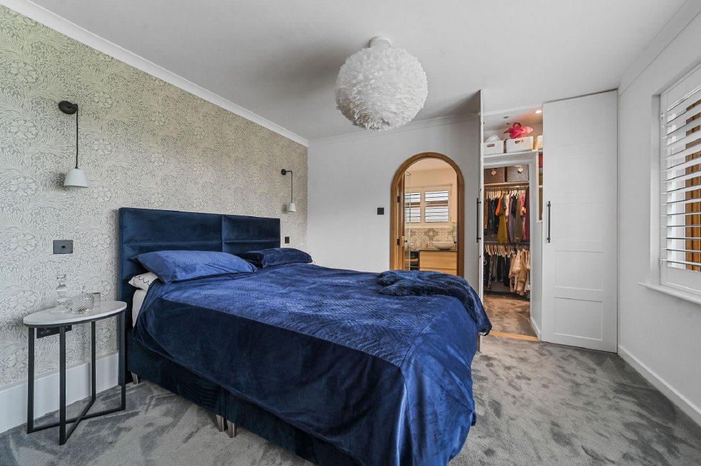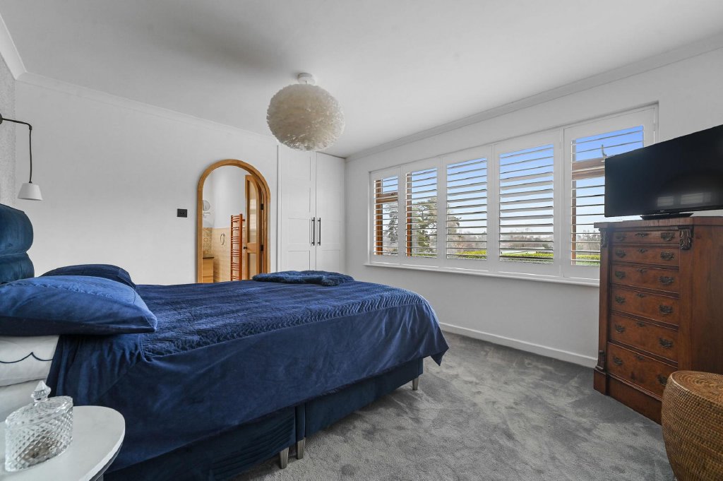 The principal bedroom is generous and enjoys a peaceful view of the front garden. Plantation shutters provide privacy while softly filtering the light and a newly added walk-in wardrobe offers excellent storage. A handcrafted bespoke solid oak archway and doors lead seamlessly from the bedroom into the striking ensuite shower room.