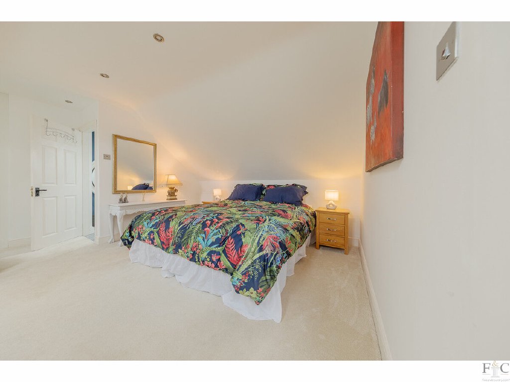 Off the kitchen to the rear, a further inner hallway provides access to a utility room and WC with space and plumbing for white goods, along with additional cupboard storage. Stairs rise to the fourth bedroom — a generously proportioned room with four skylights, built-in wardrobes and eaves storage, served by a private ensuite shower room.