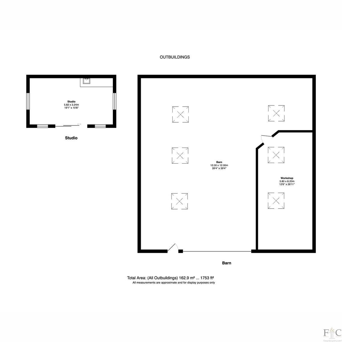 This separate outbuilding currently operating as an art studio measures approximately 19'1 x 10'8 (5.82m x 3.24m).
