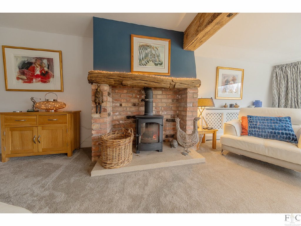 The property is entered via a glazed door into a welcoming entrance hall with useful storage. To the right, the sitting room is a wonderfully comfortable space featuring a large bay window and French doors to the front elevation, framing stunning views across the lawns and lake. A feature fireplace with exposed brick surround, timber mantel and log burner inset creates a superb focal point.