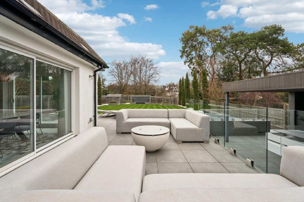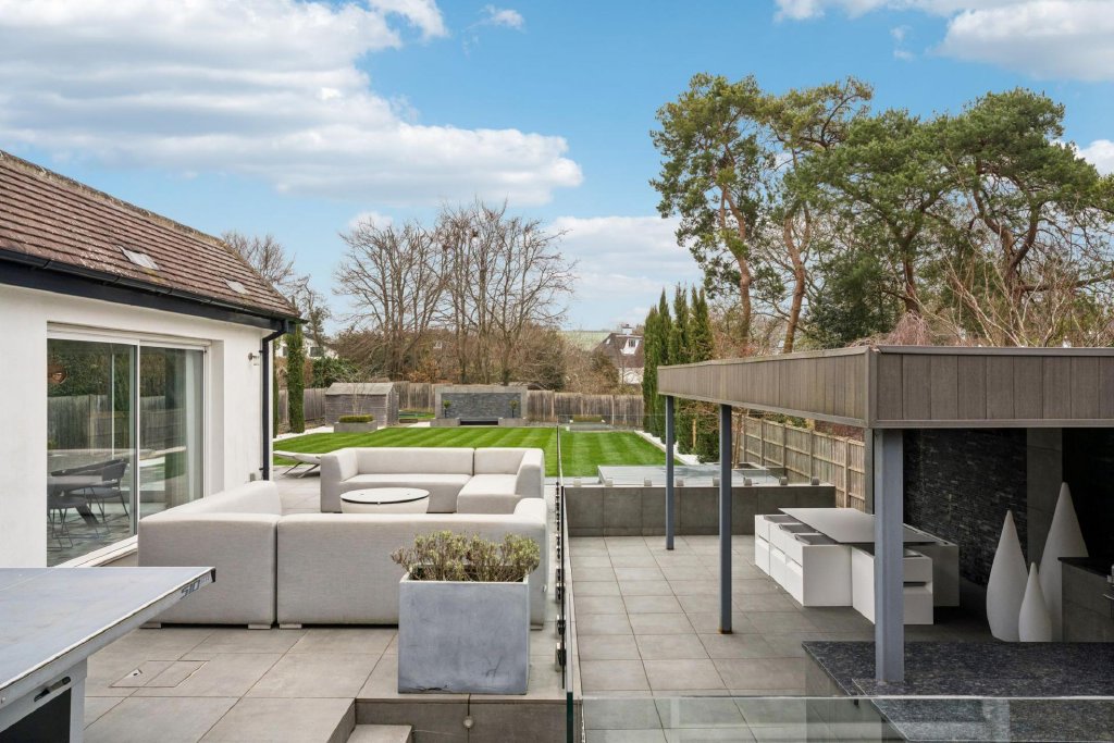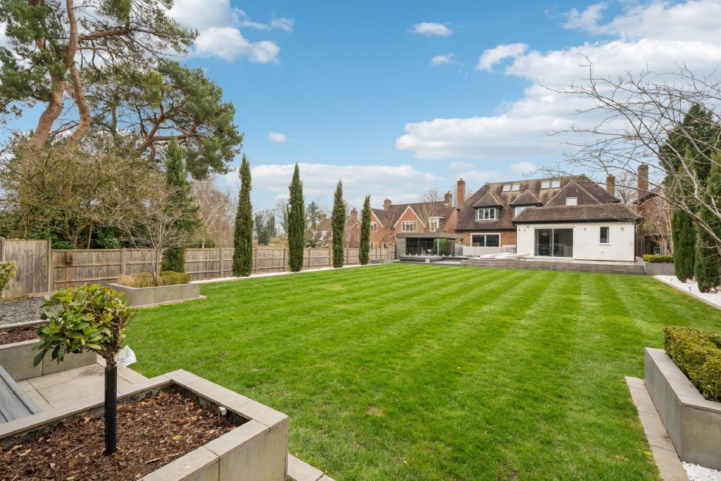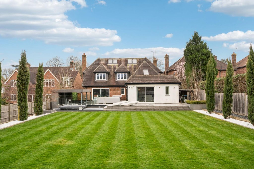 The rear garden features an expansive lawn, a striking feature wall with integrated seating and raised flower beds, and a sunken trampoline tucked away at the far end of the garden.