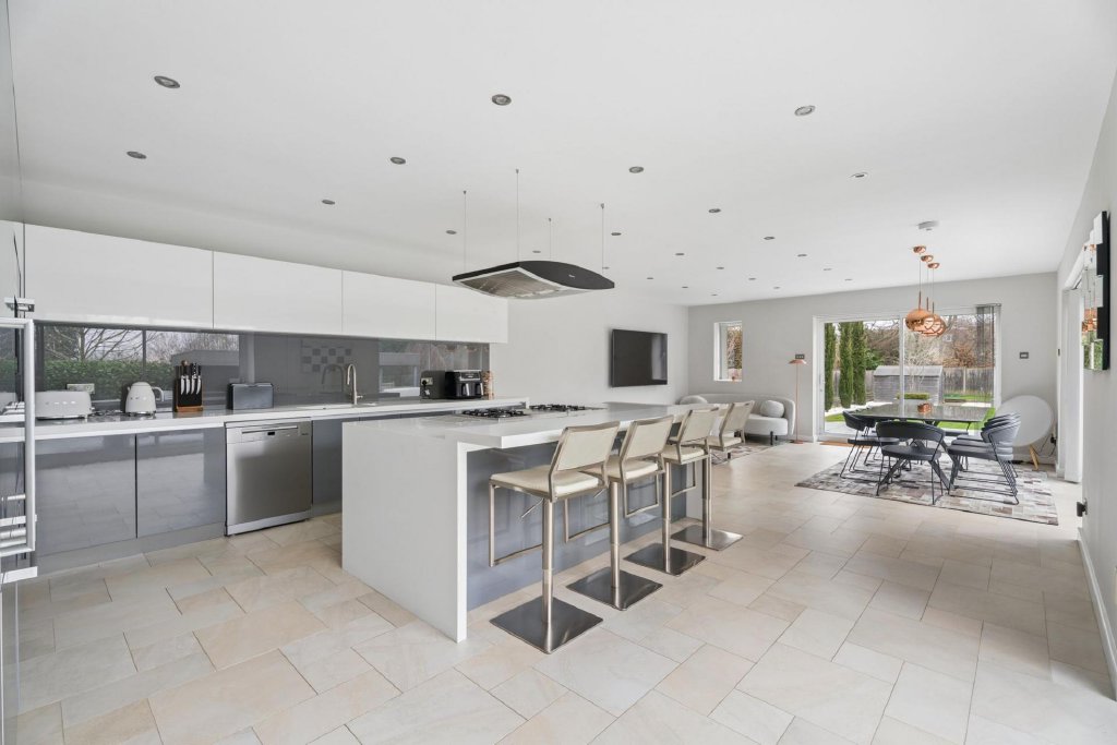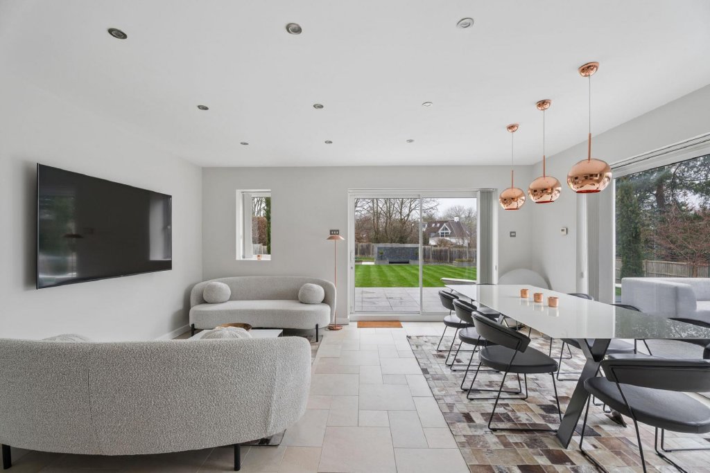 To the rear, the outstanding open-plan kitchen, dining and family room forms the heart of the home and an exceptional entertaining space. Bathed in natural light from expansive sliding glass doors, this stunning room enjoys uninterrupted views over the terrace and beautifully landscaped garden beyond.