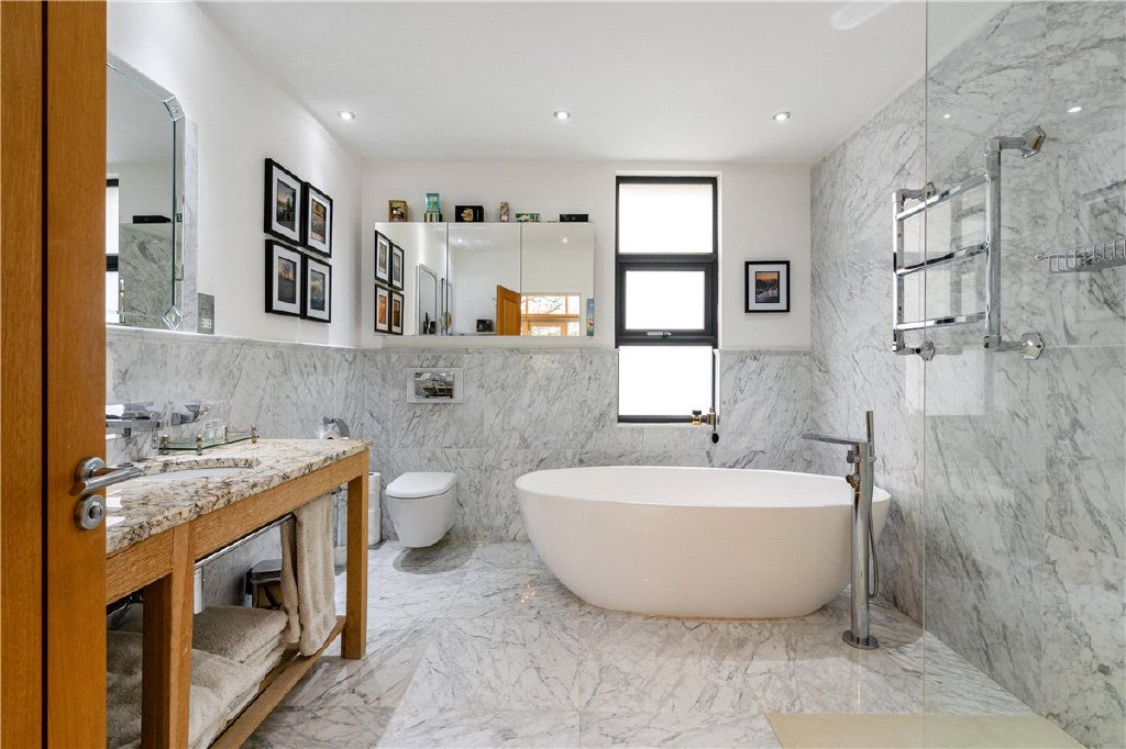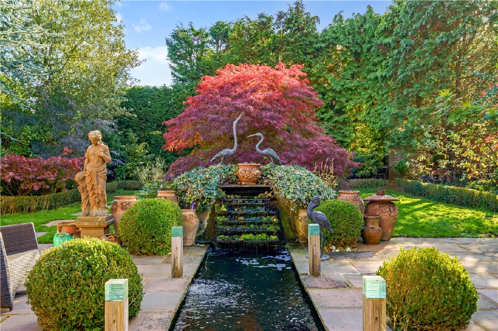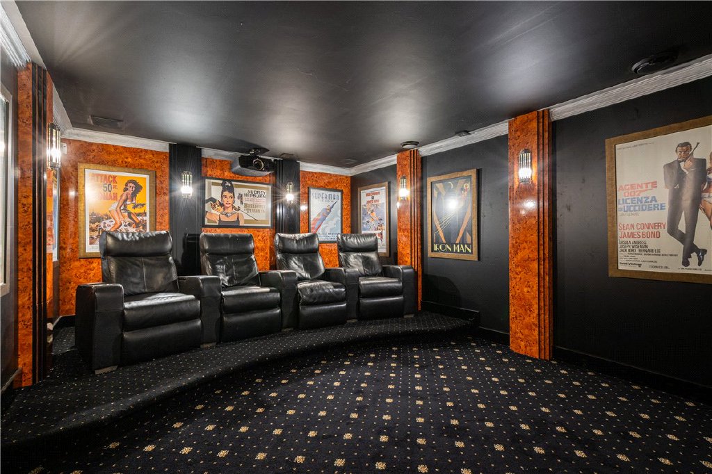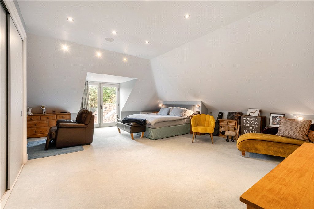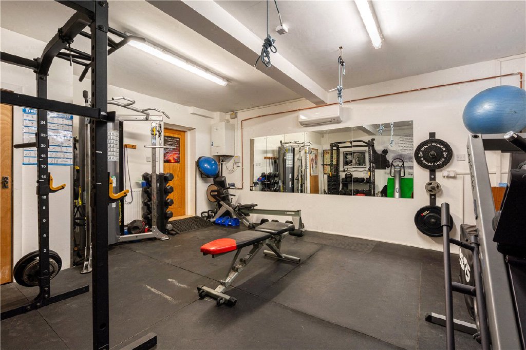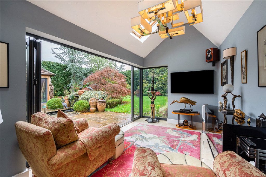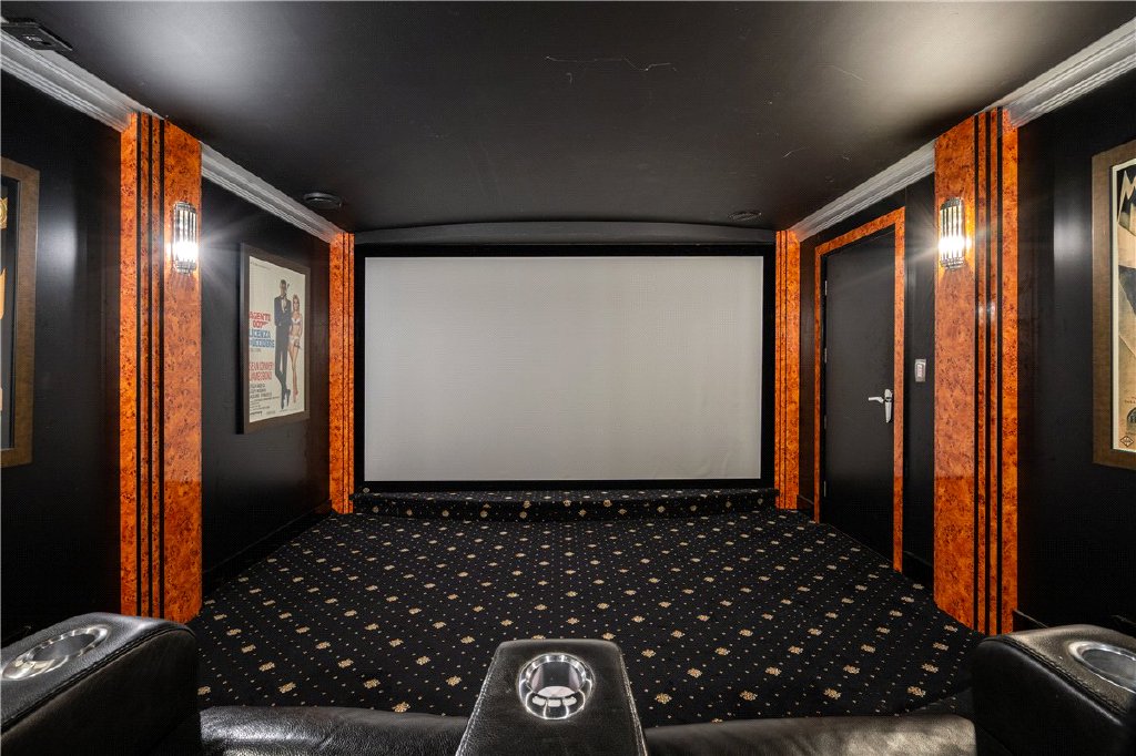 The ground floor includes a generous reception hall, large study, dedicated sound-proofed cinema room, and elegant sitting room connecting through to a vast open-plan kitchen, dining and family area opening directly onto the landscaped garden. A utility and boot room add to the practicality, while the converted garage now serves as a superb home gym.