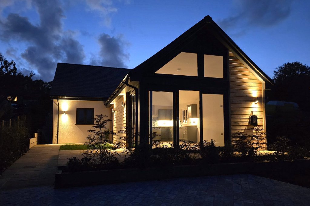 Built to an exceptionally high standard, the home combines modern sustainability with stylish design. The exterior blends smooth stucco with larch cladding beneath a natural slate roof, while sustainable features include solar panels, an air-source heat pump, high-grade insulation, underfloor heating, and double glazing throughout.