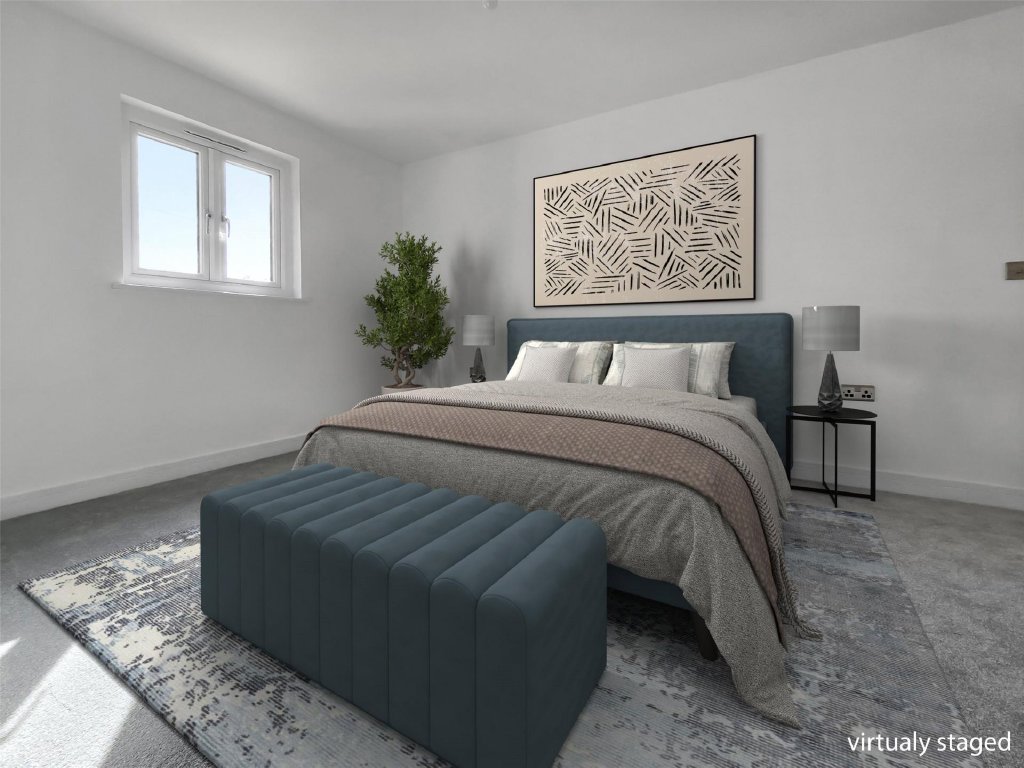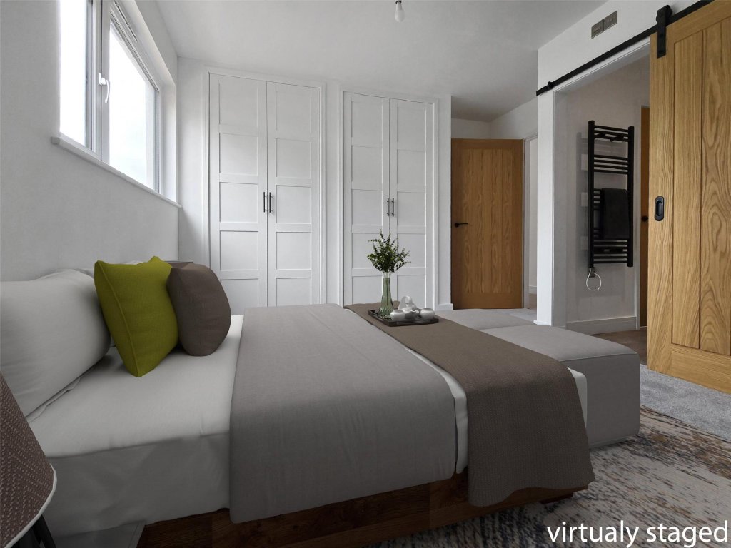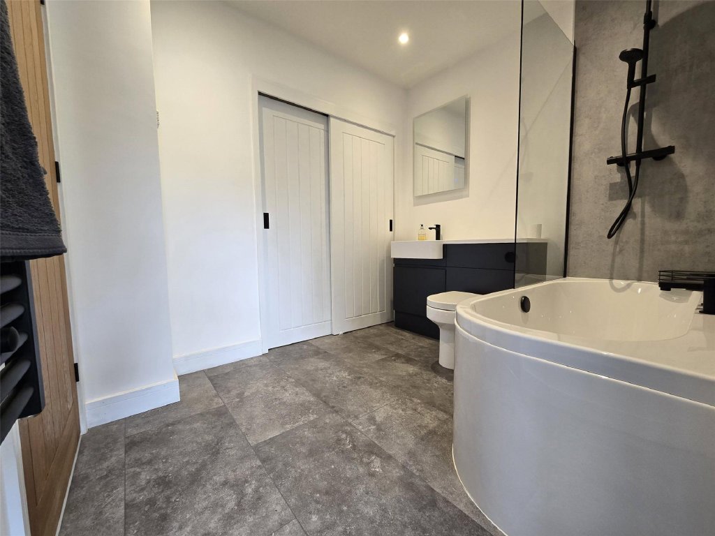 The principal bedroom enjoys sea views, space for wardrobes, and a stylish en-suite shower room. The second double bedroom benefits from fitted storage and access to the Jack-and-Jill family bathroom.