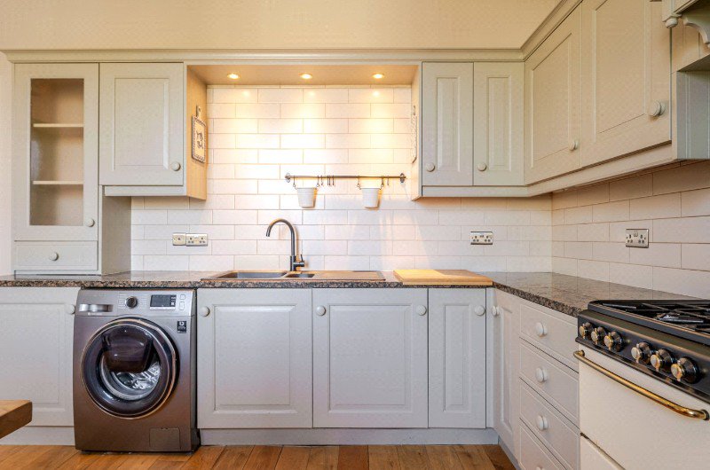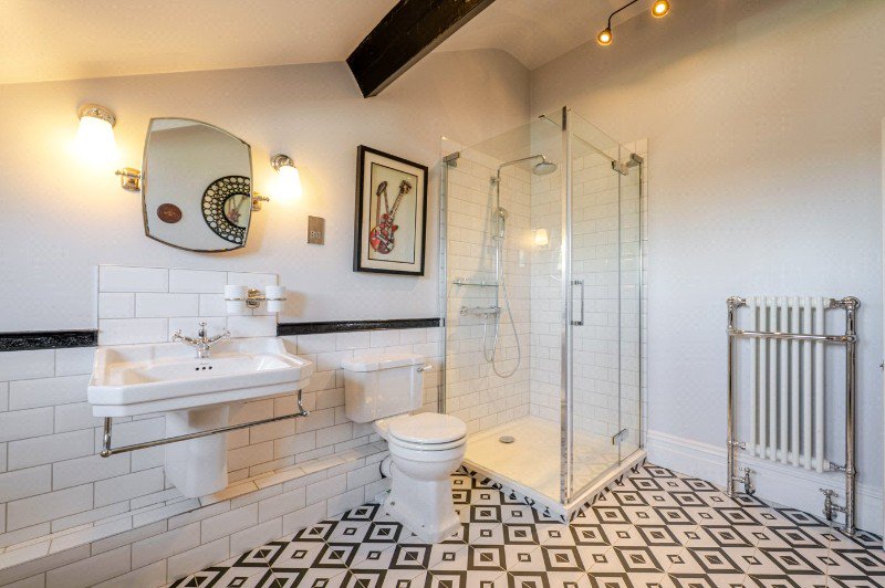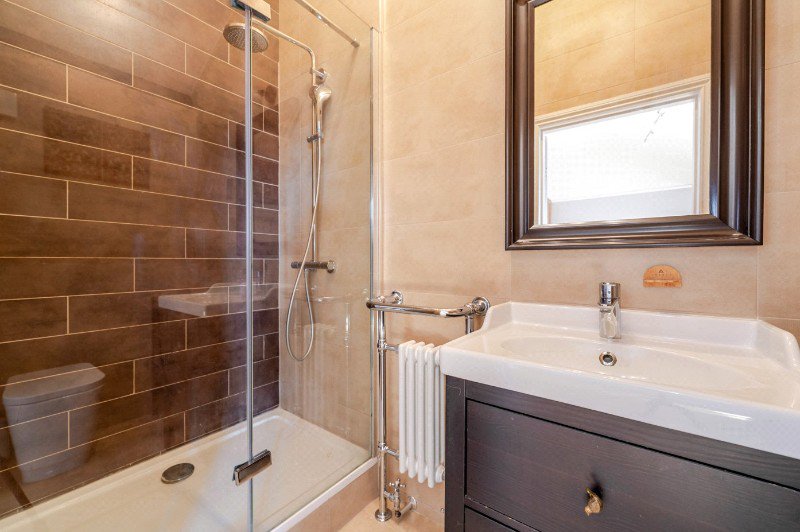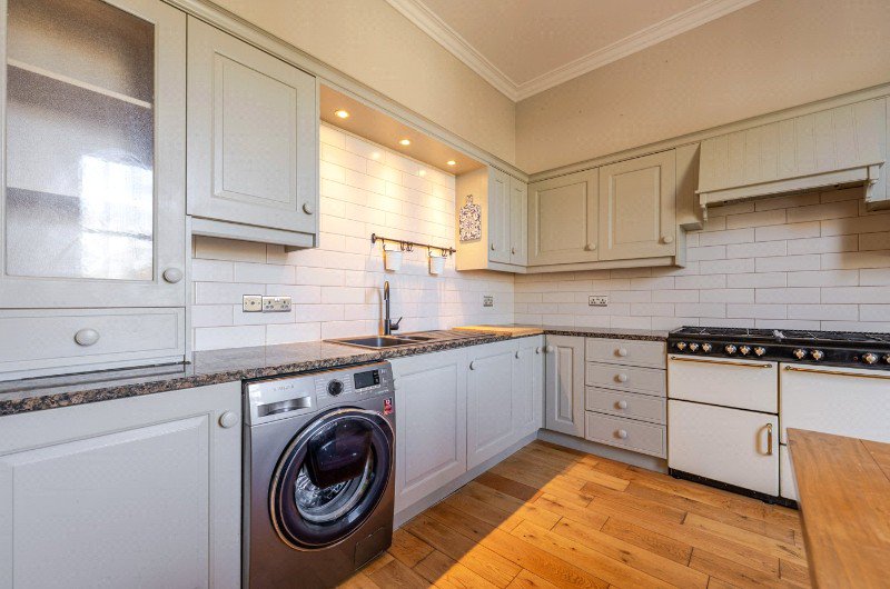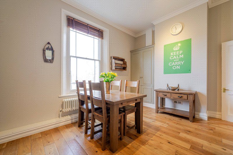 The beautiful kitchen/diner is bright and elegant, with an abundance of natural light from the front facing sash window. The kitchen is fitted with a range of classic shaker-style units, complemented by wooden worktops and tiled splashbacks, offering both practicality and charm. There is ample space for dining, making this a sociable and functional area. Also on this level is a modern WC, finished with contemporary tiling and fittings.
