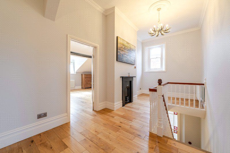 The property is accessed via an impressive communal entrance, reflecting the building’s Regency heritage, with stairs rising to the apartment.