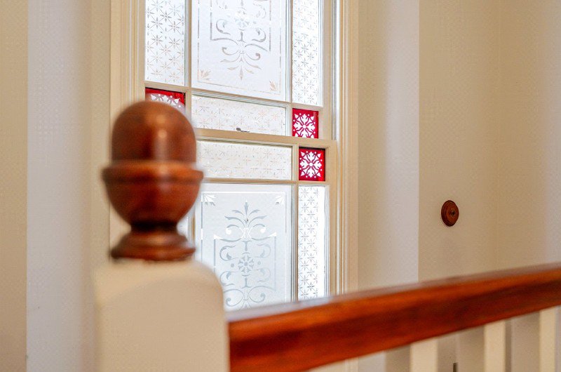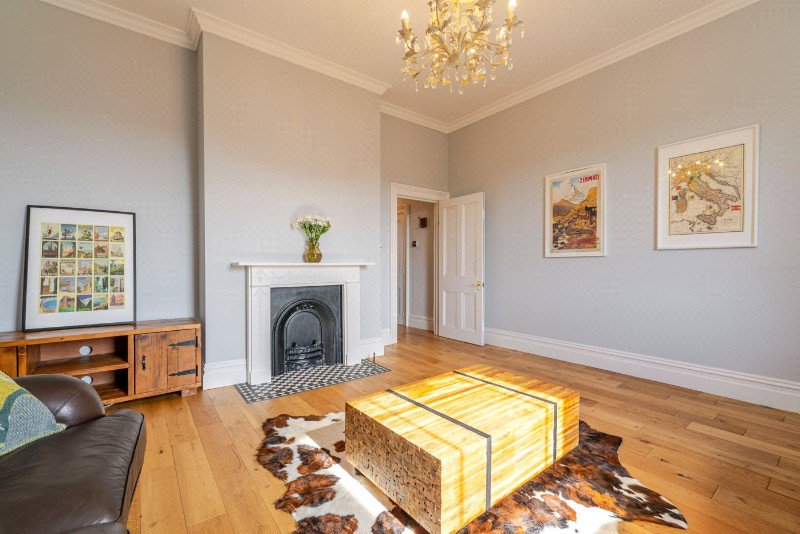 Upon entering, a welcoming hallway provides access to all principal rooms. The living room is a particularly striking space, featuring high ceilings, large sash windows and a feature fireplace, creating a superb setting for both relaxing and entertaining.