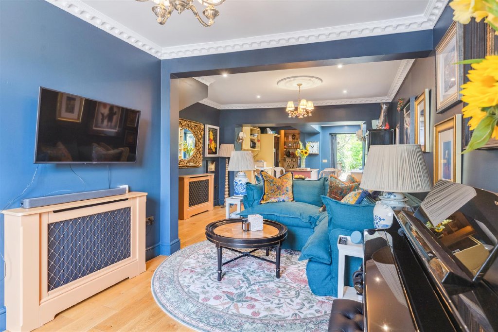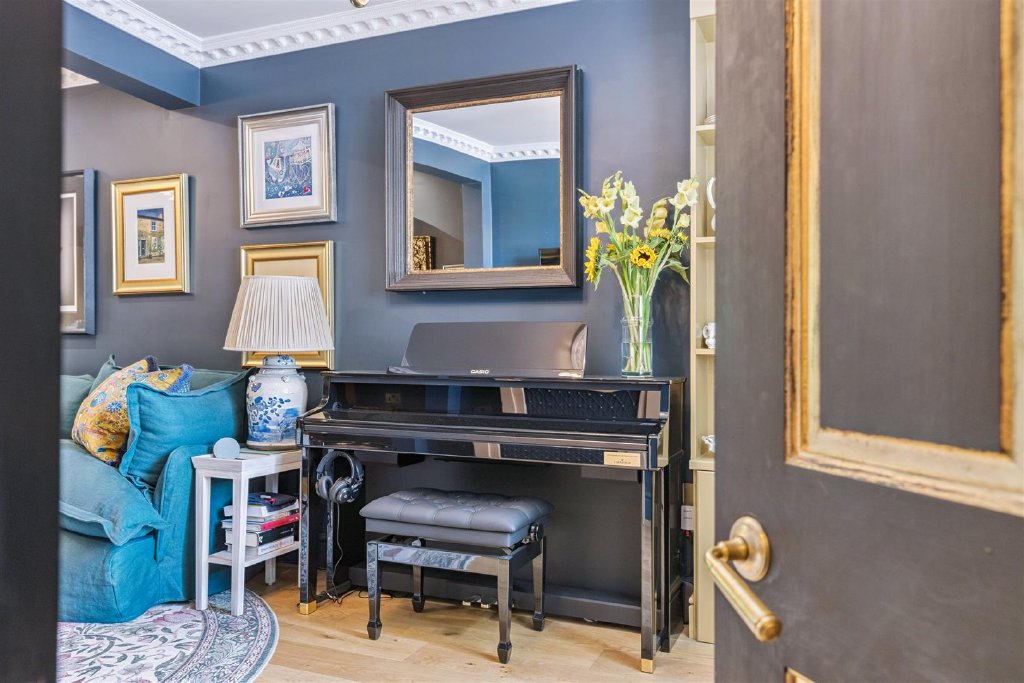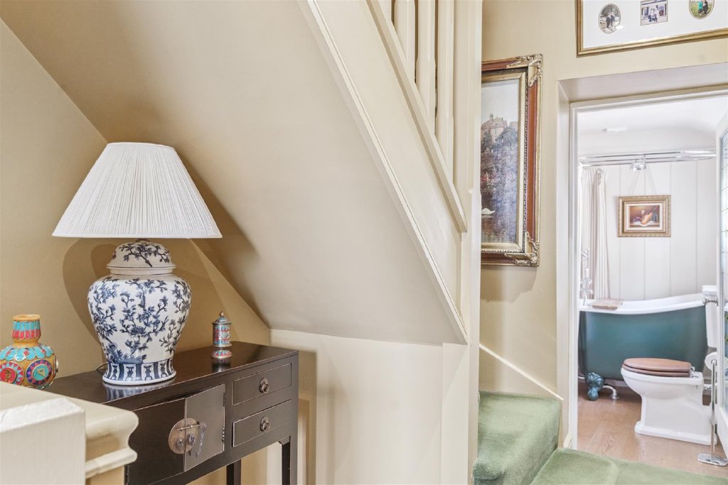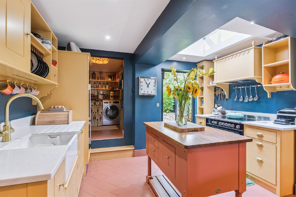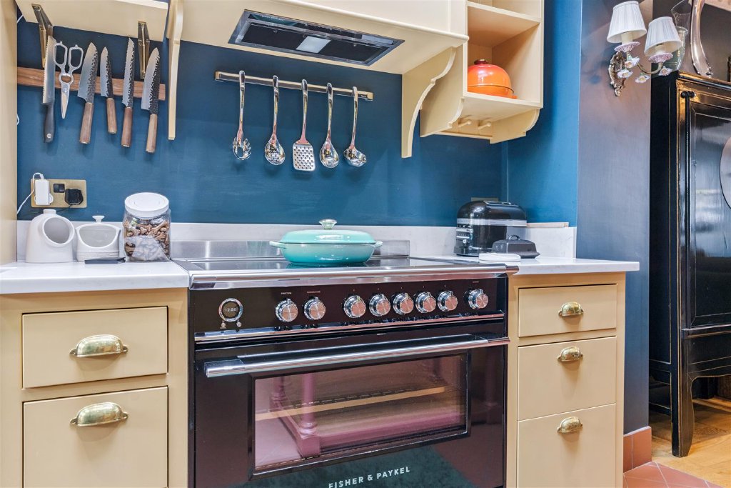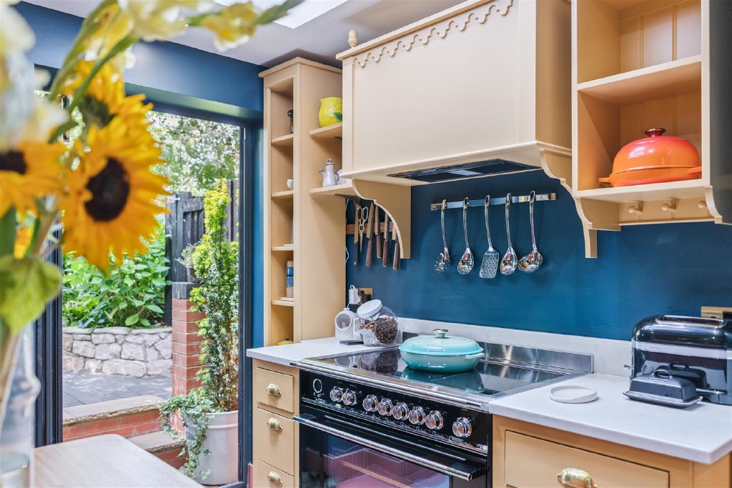 Located in the historic Olney High Street this impressive stone built property has a date stone of 1895 mounted over an arched doorway. Over the solid wooden entrance door there is a notable and decorative half moon shaped window in stained glass. Opening the door we find a small lobby from where the staircase rises to the first floor and a door to the right opens to the principal reception area. The combined sitting, dining and kitchen areas are open plan to each other with a sash window to the front, having secondary glazing with hand crafted shuttering. Elaborate cornice work is apparent around the ceiling with centrally located extremely decorative ceiling roses. The flooring throughout is in hard wearing wood. The sitting area seamlessly flows into a dining space which has recessed lighting to the ceiling directly overhead. Carry on into the kitchen which has a delightful lantern roof shedding light all around and glazed bi-fold doors which open fully to the garden. Various cupboards and shelving units are conveniently arranged within the kitchen which has a butler sink and a housing for a large range style oven. The seller is prepared to negotiate separately for the existing, top of the range, "Fisher and Paykel" cooker, the fridge freezer and the chopping block. Steps up to a small room adjacent which is open to the kitchen and offers further shelving and cupboard units with good work and preparation surfaces. Plumbing is installed to this area for a washing machine. Flooring here is in Quarry tile.