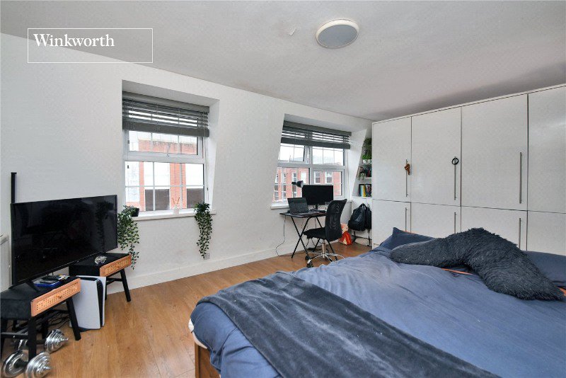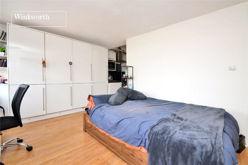 The property offers a spacious studio room with generous built-in cupboard space, creating a practical and comfortable living area with plenty of storage. There is an open-plan fitted kitchen, a bathroom with bath, WC and hand basin and an entrance hall featuring a large storage cupboard.