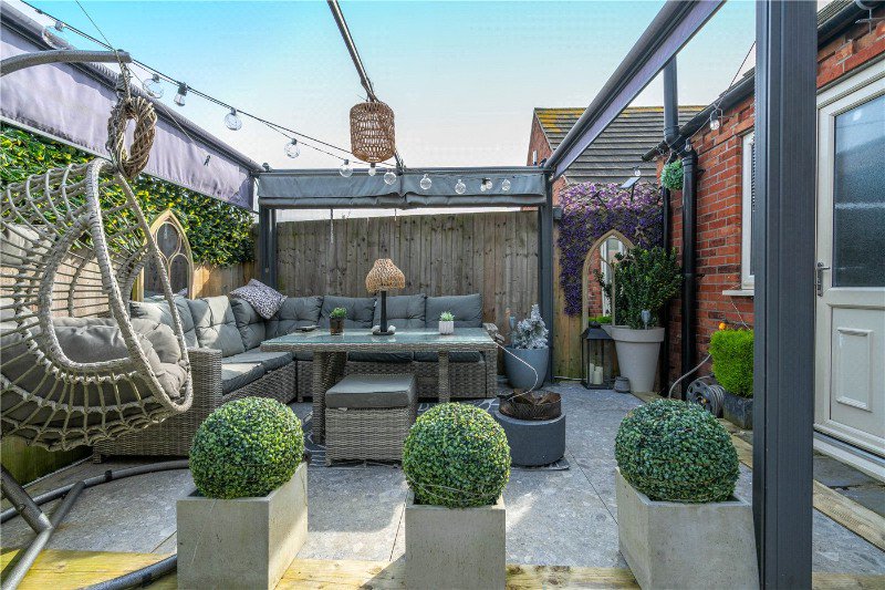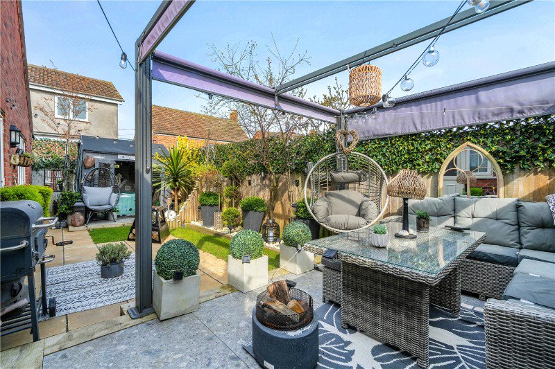 Outside, the rear garden has been cleverly landscaped to create a private and low-maintenance retreat. Immediately adjoining the property is a paved patio leading to a superb covered pergola seating area, ideal for outdoor dining and entertaining. This sheltered space comfortably accommodates a large seating arrangement and benefits from feature lighting and decorative planting.