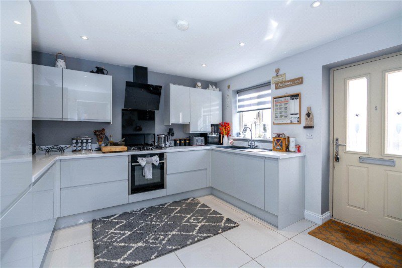 The kitchen is fitted with sleek, high-gloss units, offering generous storage and worktop space, integrated appliances, a gas hob with extractor, built-in oven and space for additional appliances make this a highly functional space.