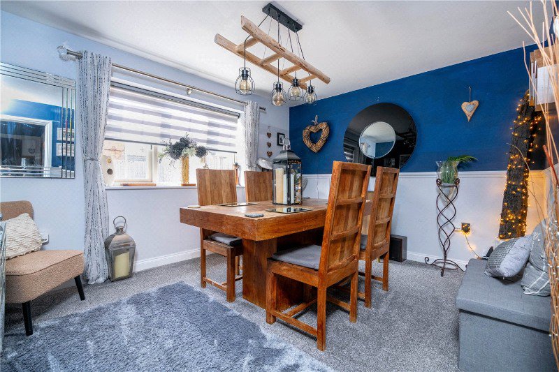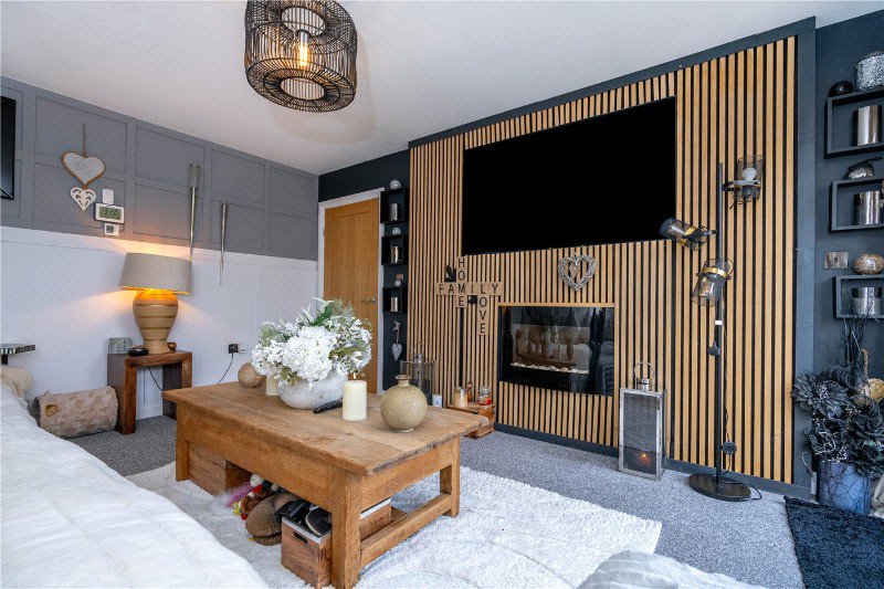 Internally, the accommodation is thoughtfully arranged and finished to a high standard throughout. The lounge is a standout space, beautifully styled and flooded with natural light via French doors opening directly onto the rear garden. A striking contemporary media wall with inset electric fire creates an eye-catching focal point, complemented by modern panelling and coordinated décor.