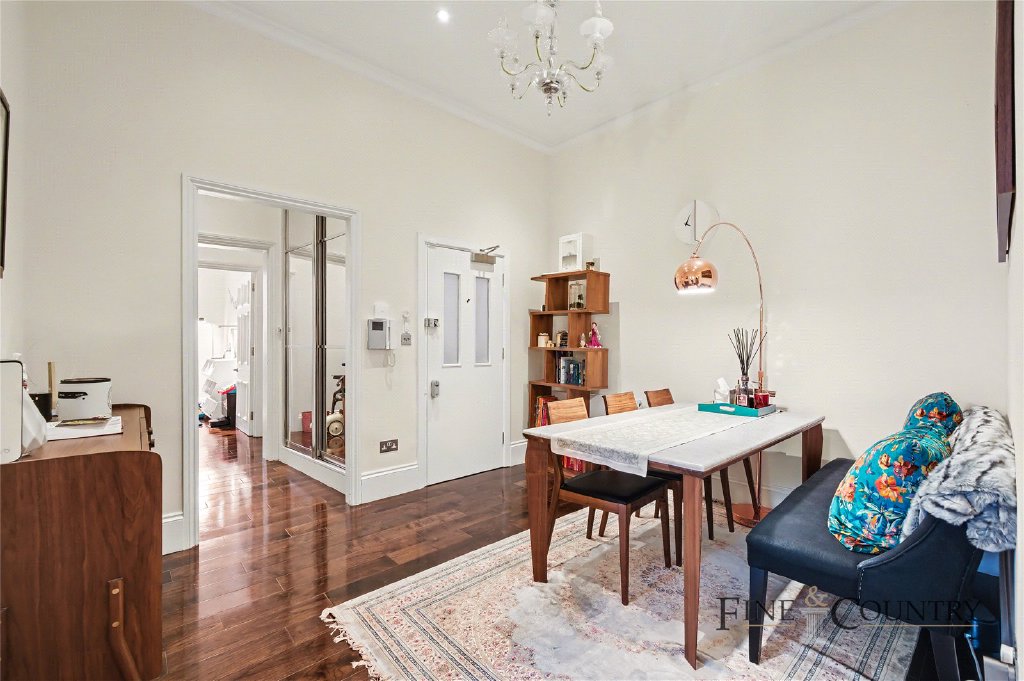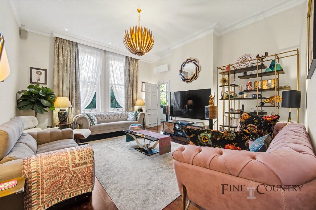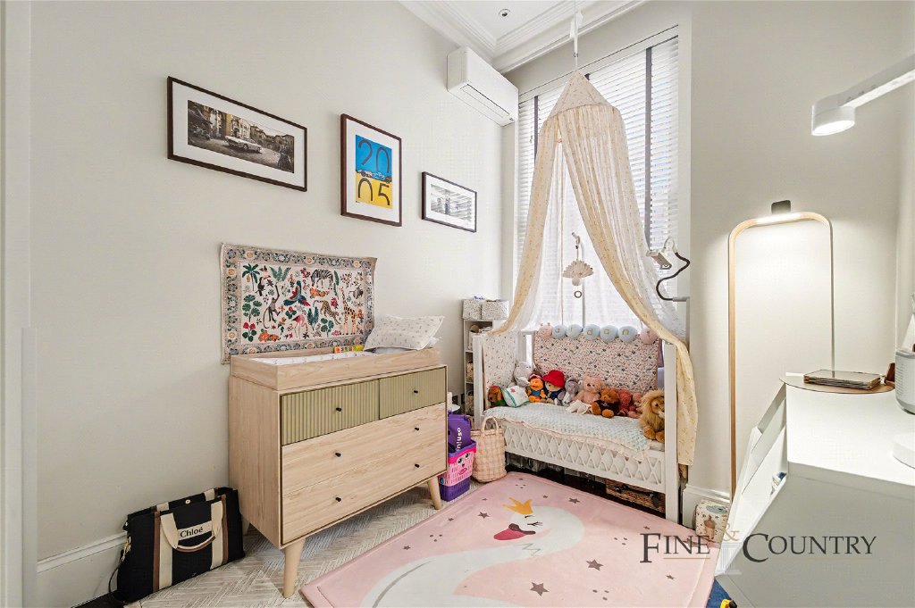 The reception room is particularly impressive and conveys a beautifully proportioned space centred around a large bay window that draws in soft natural light. The ceiling height amplifies the volume of the room, while the detailing of the cornicing adds a layer of classical elegance. This is a space equally suited to formal entertaining or relaxed day-to-day living.