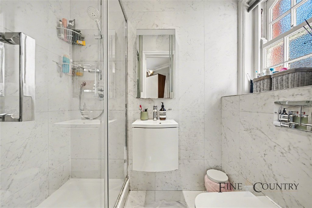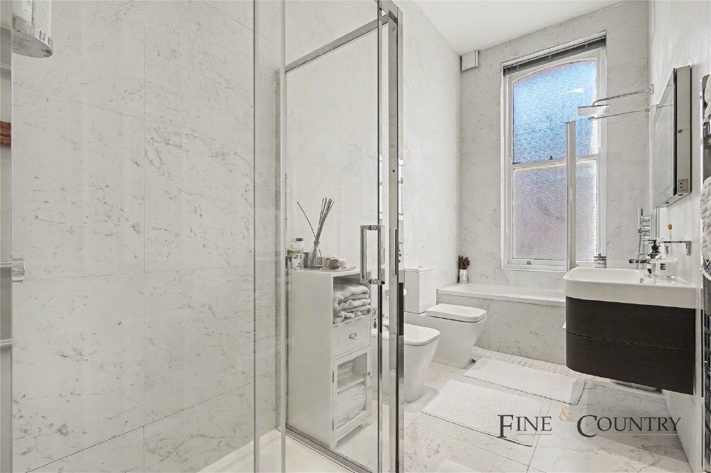 The bedrooms are all well-proportioned, each benefiting from excellent ceiling height, large sash-style windows and built-in storage. The principal bedroom offers a calm and refined retreat, complete with a well-appointed en suite bathroom finished in marble-style tiling with high-quality fittings. The additional bedrooms are equally versatile, suitable for guest accommodation, family use or a home office. The main bathroom continues the same design language, finished to a high standard with clean lines and contemporary fixtures.