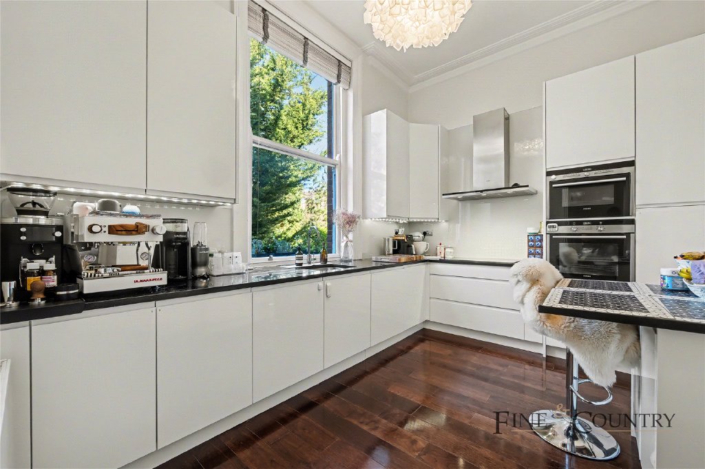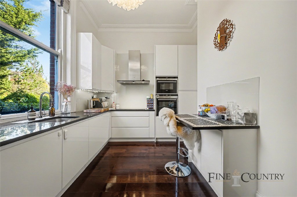 The kitchen has been thoughtfully designed in a contemporary style, with sleek, handleless cabinetry, stonework surfaces and fully integrated appliances. Positioned to the rear, it enjoys a leafy outlook, reinforcing the calm and private feel of the apartment. A discreet breakfast bar further enhances its practicality.