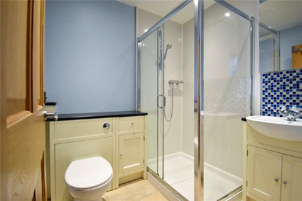 The stylish downstairs shower room includes a large shower cubicle, a contemporary WC with concealed cistern, and a matching hand wash basin.