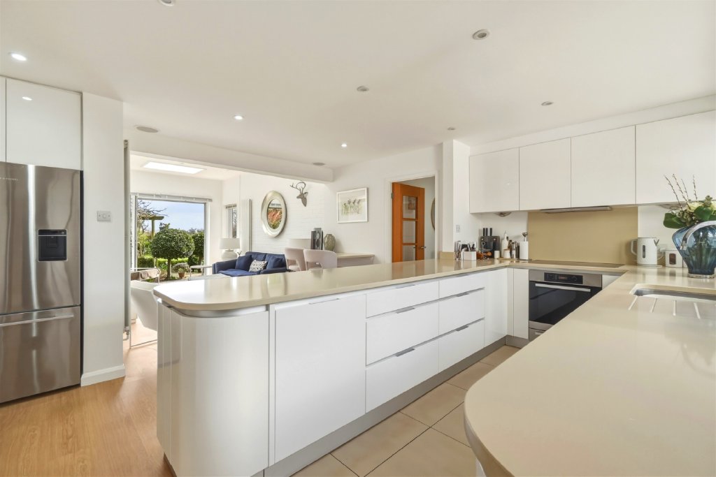 The property immediately impresses with its attractive frontage, extensive gravel driveway and excellent parking provision, complemented by a detached garage. Internally, the home has been designed to maximise light and space, featuring a stunning open-plan kitchen/dining room ideal for modern family living and entertaining, alongside a substantial dual aspect reception room measuring over 29ft in length.