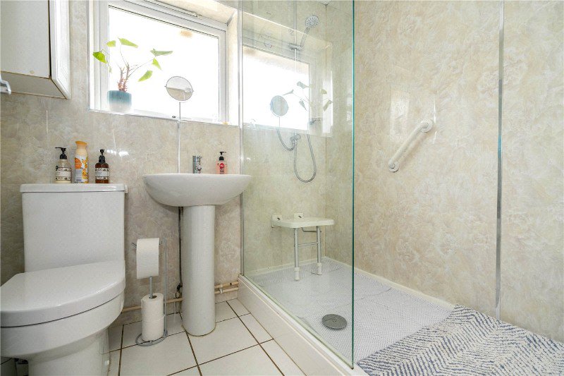 The shower room is fitted with a modern white suite, comprising a large walk-in shower, pedestal wash basin and WC.
