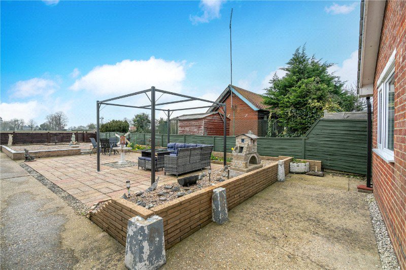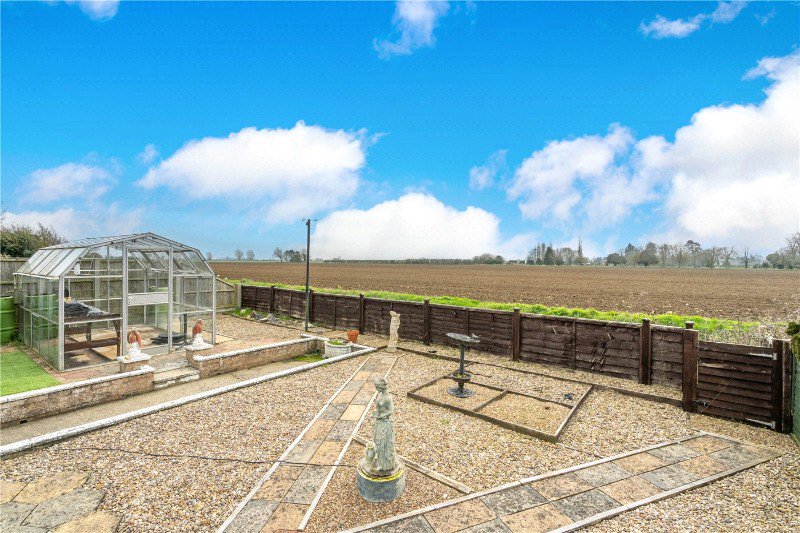 The rear garden is a particularly attractive feature of the property. Designed for ease of maintenance, it offers a combination of paved seating areas and gravelled sections, providing multiple spots for outdoor seating and enjoying the field views to the rear. There is space for potted planting and decorative features, along with a useful outbuilding and two greenhouses for gardening enthusiasts.
