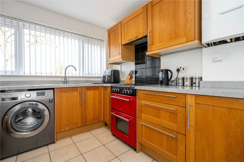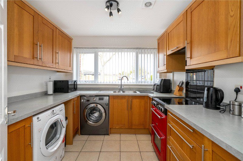 The kitchen is fitted with a range of units with complementary work surfaces and tiled flooring. There is ample storage & space for appliances.