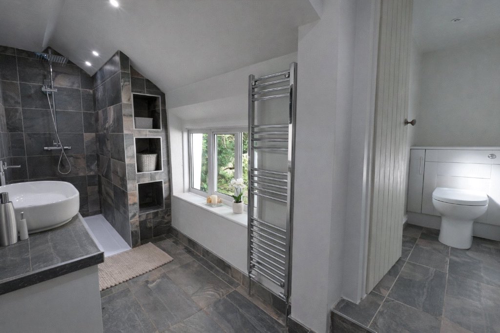 The first floor offers three bedrooms, including a principal bedroom benefiting from a modern slate-backed en-suite shower room with WC. The remaining bedrooms are well-proportioned, with some built-in storage. The family bathroom is stylishly appointed with a free-standing bath, vanity basin and concealed cistern WC with an additional shower cubicle.