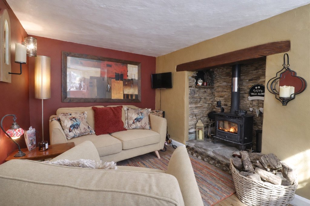 Entering the property via a pretty porch canopy with ornate owl finial, an entrance hall with a useful cupboard for shoes and coats can be found with a staircase that leads into a spacious family living room. On the opposite side of the hallway is a cosy snug with a feature stone inglenook fireplace, former bread oven and multi-fuel stove.