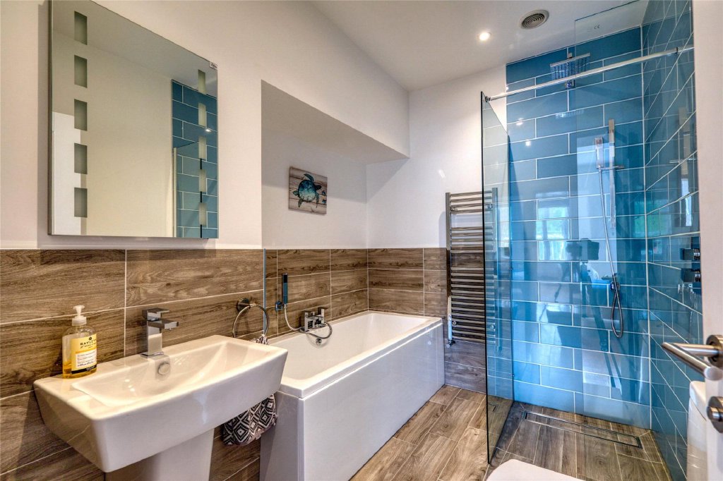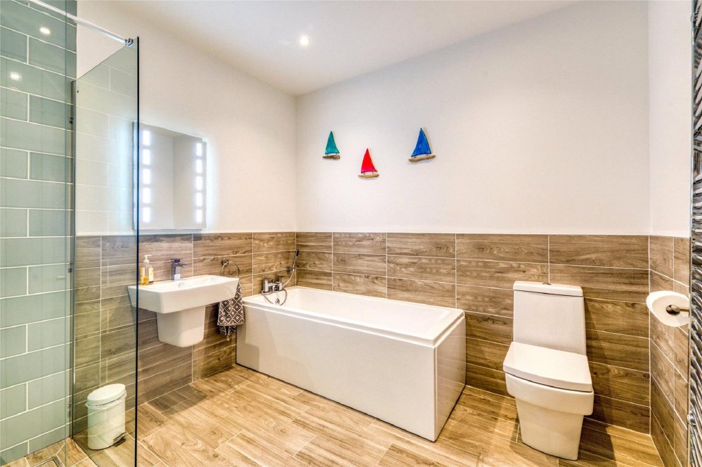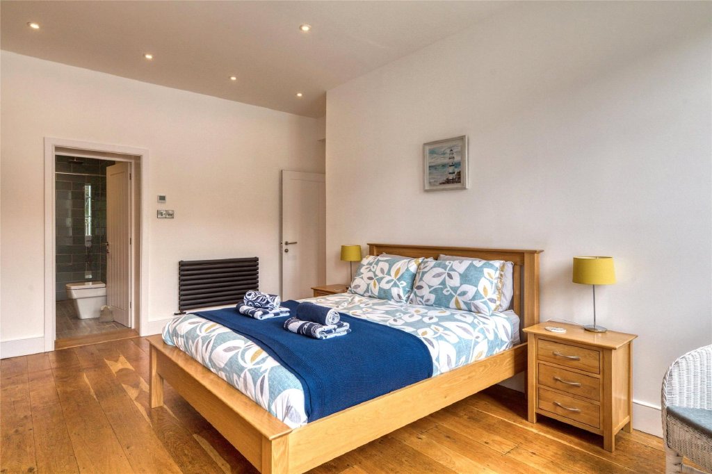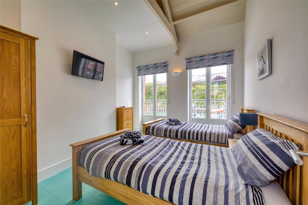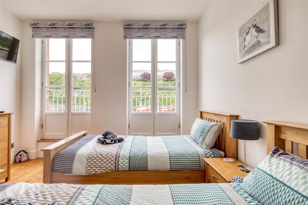 The hallway has an attractive oak floor and leads out to the front of the building where there are two generous sized bedrooms on this floor, both of which have two pairs of French doors which open as Juliet balconies and which offer delightful views over the inner harbour and moored boats and across to the town and around to Hillsborough which shelters the bay. Bedroom 1 has a fireplace feature with a decorative surround and mantle over. The large en suite bathroom is beautifully appointed and spacious having a bath as well as a separate walk-in shower cubicle and contemporary tiling. Bedroom 1 is set up as a double room whilst bedroom 2 is arranged with two single beds. The principal bathroom is another spacious facility which is well equipped and again has modern sanity ware which includes a bath and a separate walk-in shower.