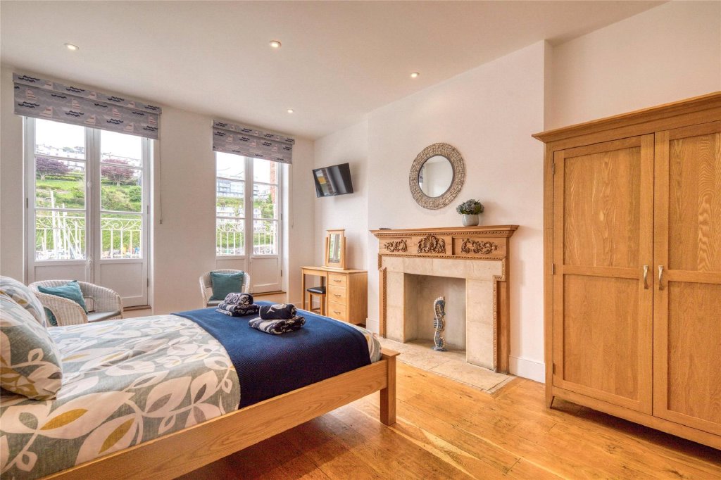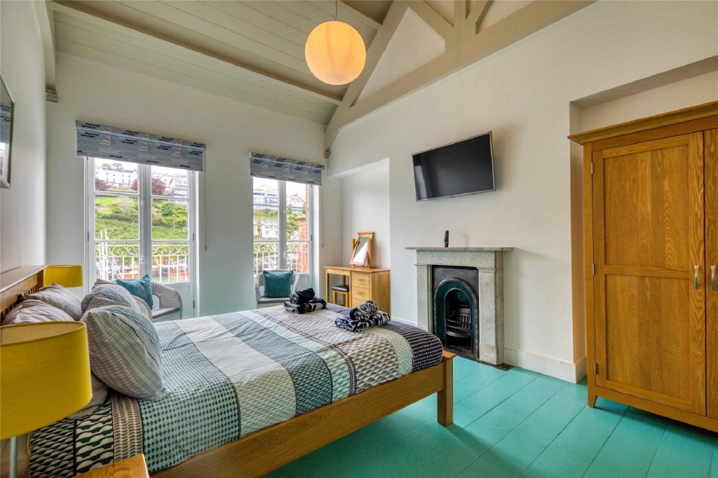 The attractive staircase with its ornate spindle balustrade continues up to the second floor. There are two further large bedrooms with the space exaggerated further by high beamed vaulted ceilings in both rooms. As with the bedrooms on the floor below, two pairs of French doors in each room forms Juliet balconies and again enjoys the ever changing harbour side views. There are period features throughout the property and in bedroom 3 there is an ornamental cast iron fireplace with a marble surround and mantle over. This floor amounts to 38m2 (404ft2).
