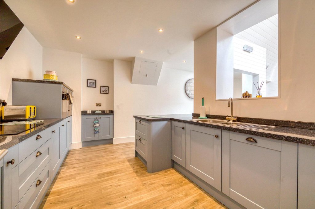 The upper floors of the building are laid out as living accommodation and could be occupied permanently if required. However, at present this area of the building is being used as a high-quality holiday let. The beautifully appointed accommodation throughout has been tastefully and expertly refurbished in recent years. On the half landing there are further Ladies and Gents WC's. The first floor amounts to 138m90ft2)2 (1,4 and has very impressive rooms across the level. The heart of the home is the fabulous and extremely impressive living room located at the rear of the building and as described earlier with its superb shapely vaulted ceiling, hardwood floor and its perfectly framed far reaching views over the Bristol Channel. The mezzanine dining area provides a further unique feature to this striking and exquisite space. There is a modern and well equipped kitchen which has an extensive range of fitted units and is inclusive of integrated appliances such as two ovens, an induction hob with an extractor canopy over, dishwasher, fridge and freezer.