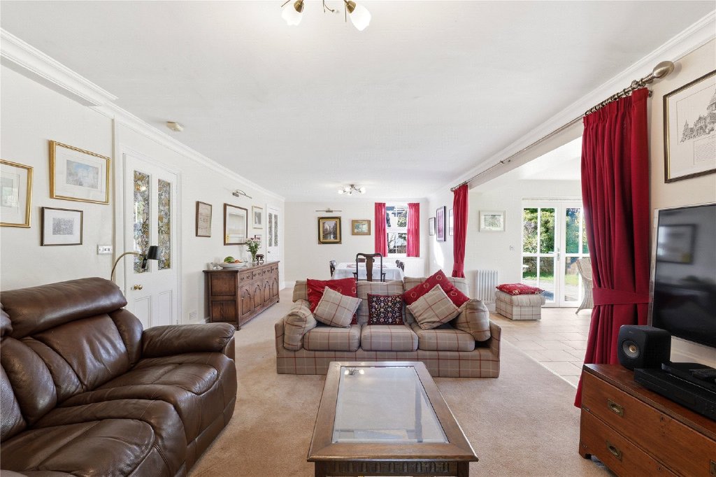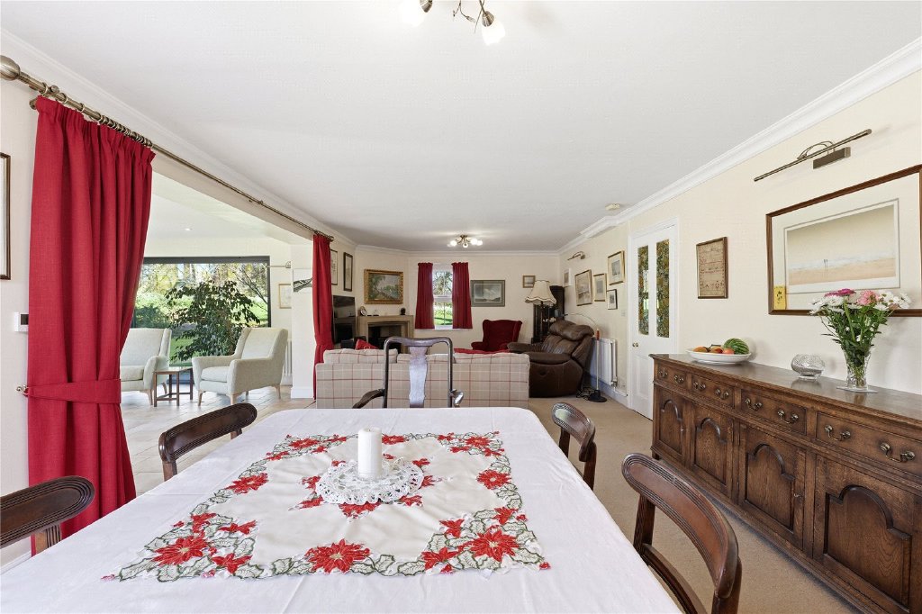 At the heart of the property is an expansive open-plan living, dining, and garden room, an inviting and versatile space equally suited to relaxed evenings or hosting on a larger scale. A striking cast iron burner set within a carved stone surround provides a beautiful focal point, while French doors and wide glazing create a seamless connection to the gardens beyond.