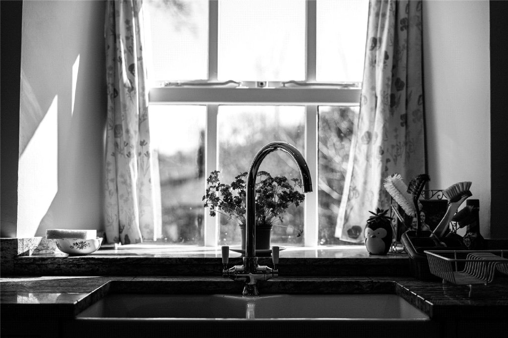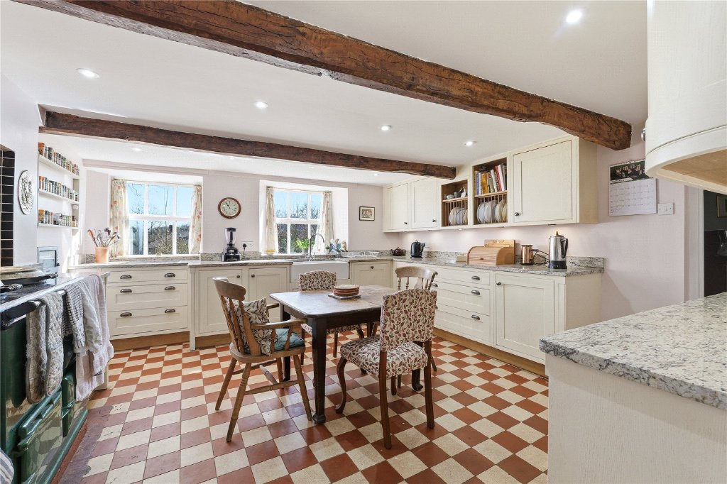 The farmhouse kitchen remains full of character, retaining the charm of the original cottage with exposed beams, a traditional Aga, and an abundance of period detailing. A separate pantry, complete with original cold slabs and a stone mullion window, adds both practicality and a tangible link to the home's heritage.