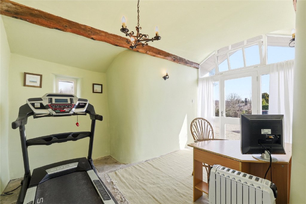 A detached stone annexe, currently used as a home office and gym, offers further flexibility and potential. The generous driveway provides parking for numerous vehicles, while a double garage, EV charging point, and solar panels add to the home's practicality and efficiency.