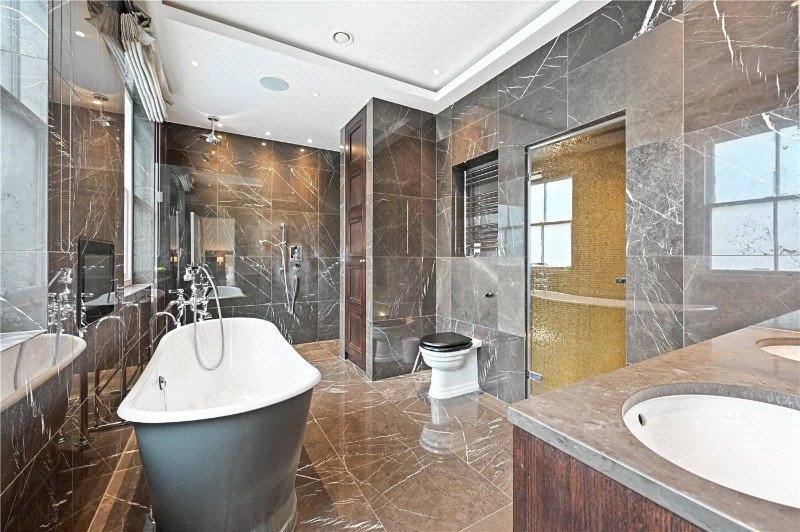 The lower floor houses an impressive principal bedroom suite with a large walk-in wardrobe and a magnificent ensuite bathroom featuring double sinks, a freestanding bath, a shower, and a steam room. There are two further double bedrooms, each with fitted wardrobes and their own en suite shower room. A utility room is also located on this floor.
