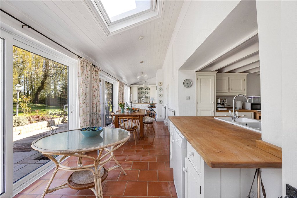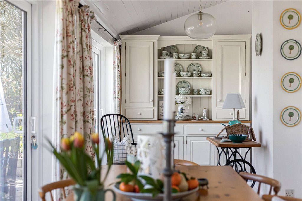Internally, the ground floor offers spacious and highly flexible accommodation. The kitchen opens into a bright dining area where glazed sliding doors span the length of the room, flooding the space with natural light and offering lovely views of the garden. A rear hall also provides direct access outside.