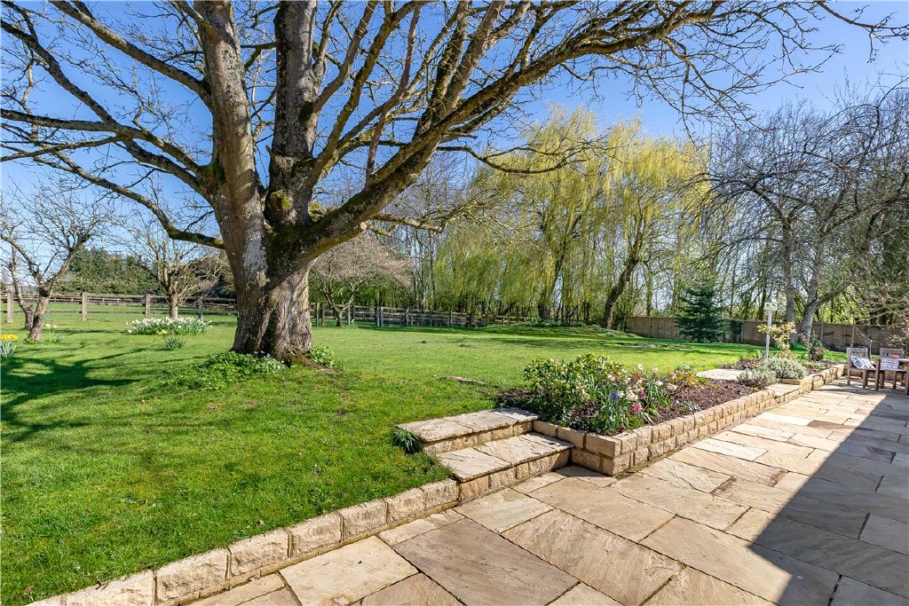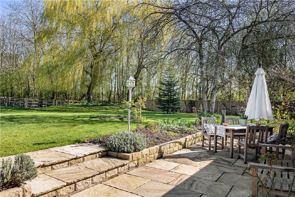 The property is approached through gates leading to a gravel driveway at the side of the house, providing parking for several vehicles and access to the garage. Adjoining the neighbouring paddock the beautifully maintained gardens wrap around the rear and side of the house, laid mainly to lawn with mature borders, shrubs, and established trees, including a magnificent willow. A terrace runs along the length of the house, creating a lovely setting for al fresco dining and enjoying the outlook. A further terrace off the sitting room provides an additional seating area. Within the garden are two useful garden sheds.