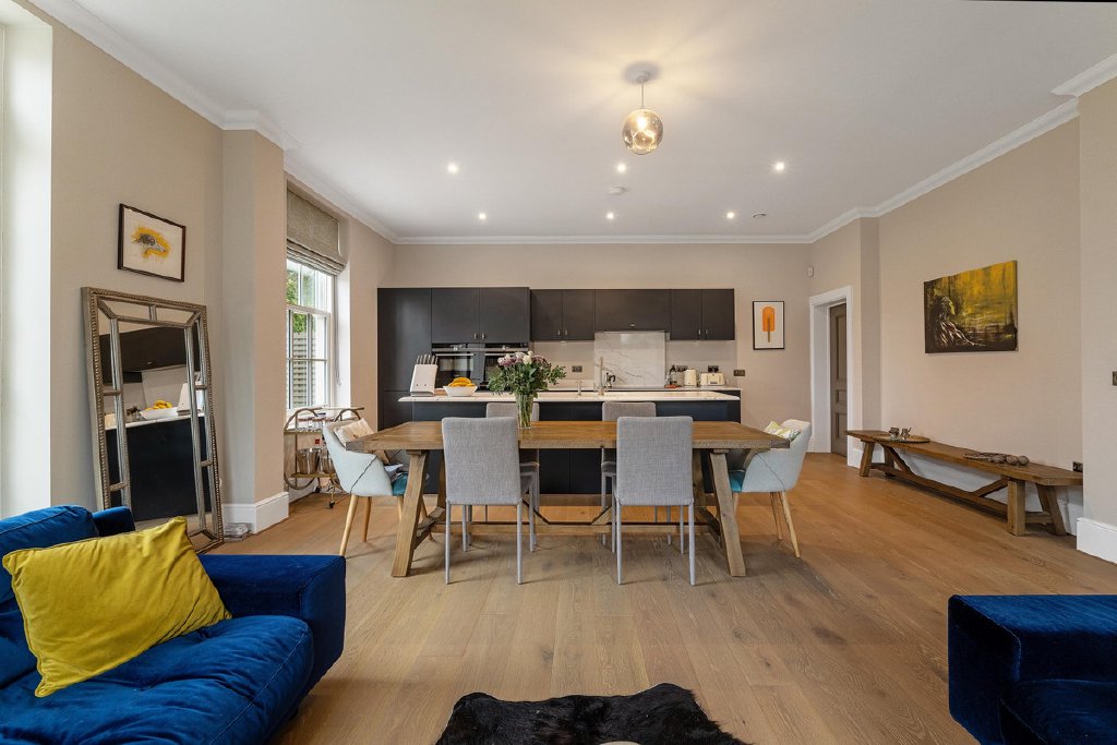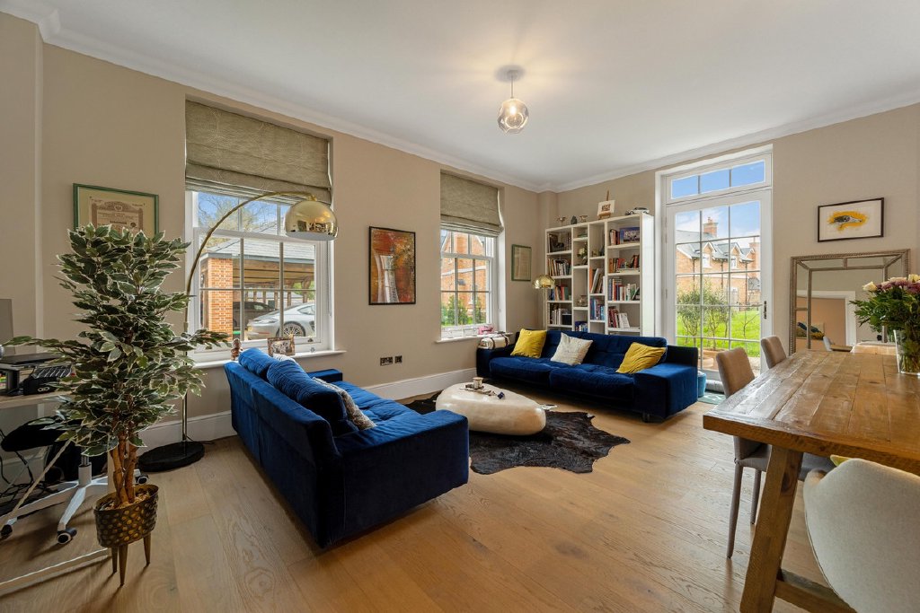A generous entrance hall sets the stage, leading through to a remarkable open-plan living space where volume, light and proportion take centre stage. Three-metre-high ceilings and expansive glazing invite the outside in, while French doors open onto a private terrace, overlooking landscaped gardens and Winkfield Park Polo Club.
